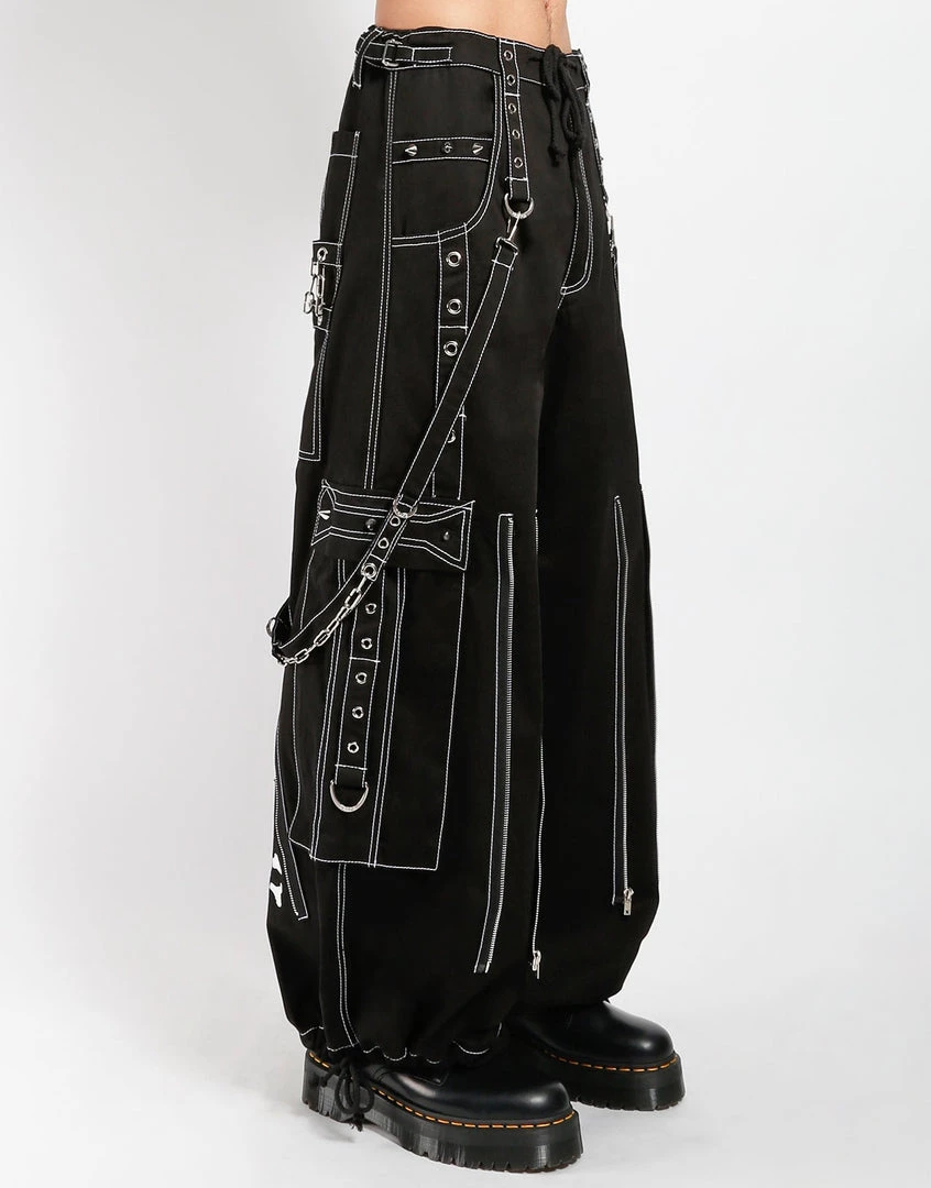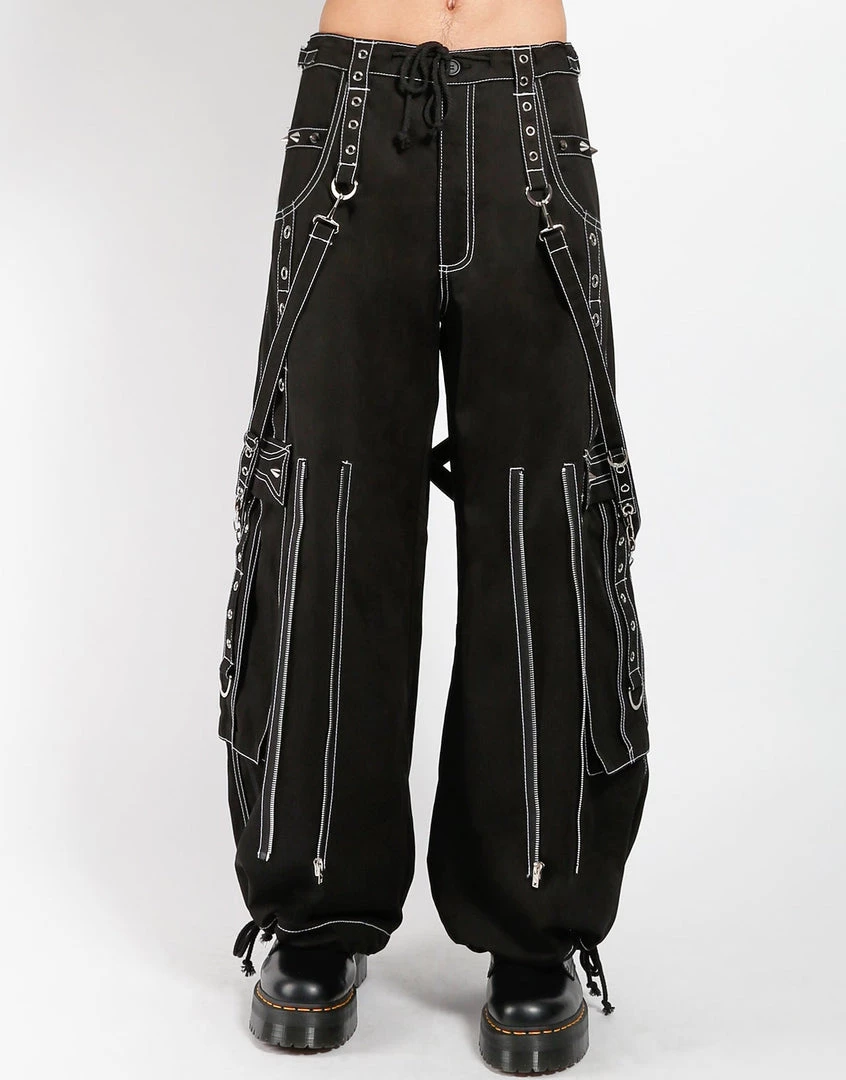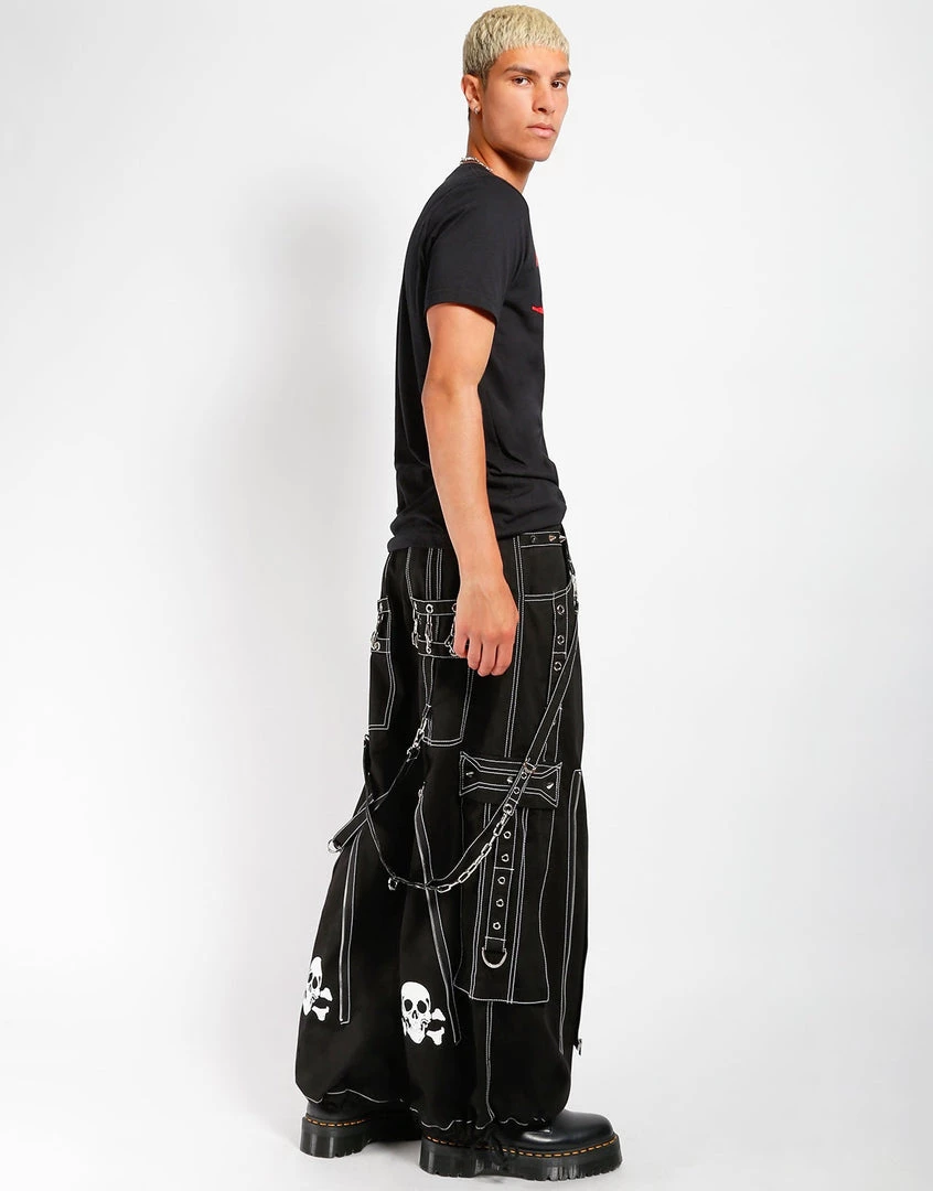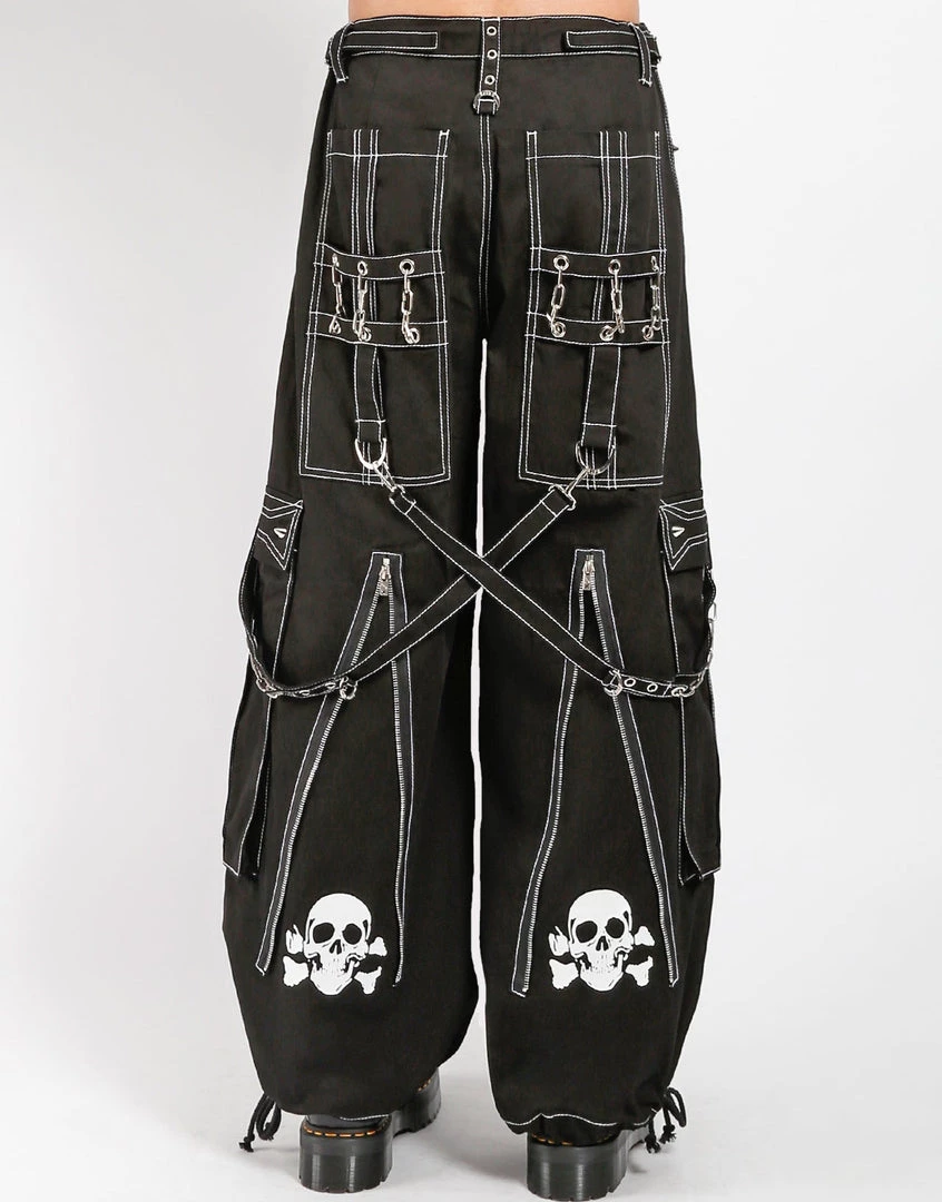 Accept no imitations! From the originator of all things DarkStreet, these black pants feature printed skulls and white stitching, removable straps, adjustable ankles, D-rings, and deep pockets.