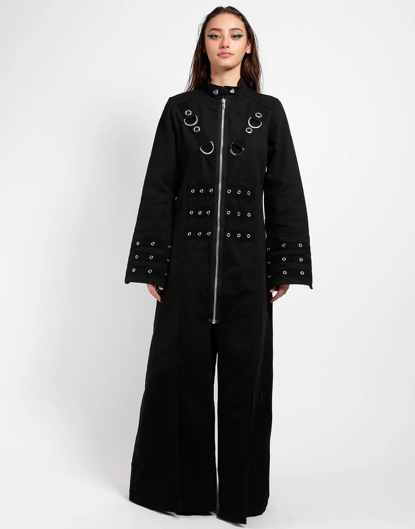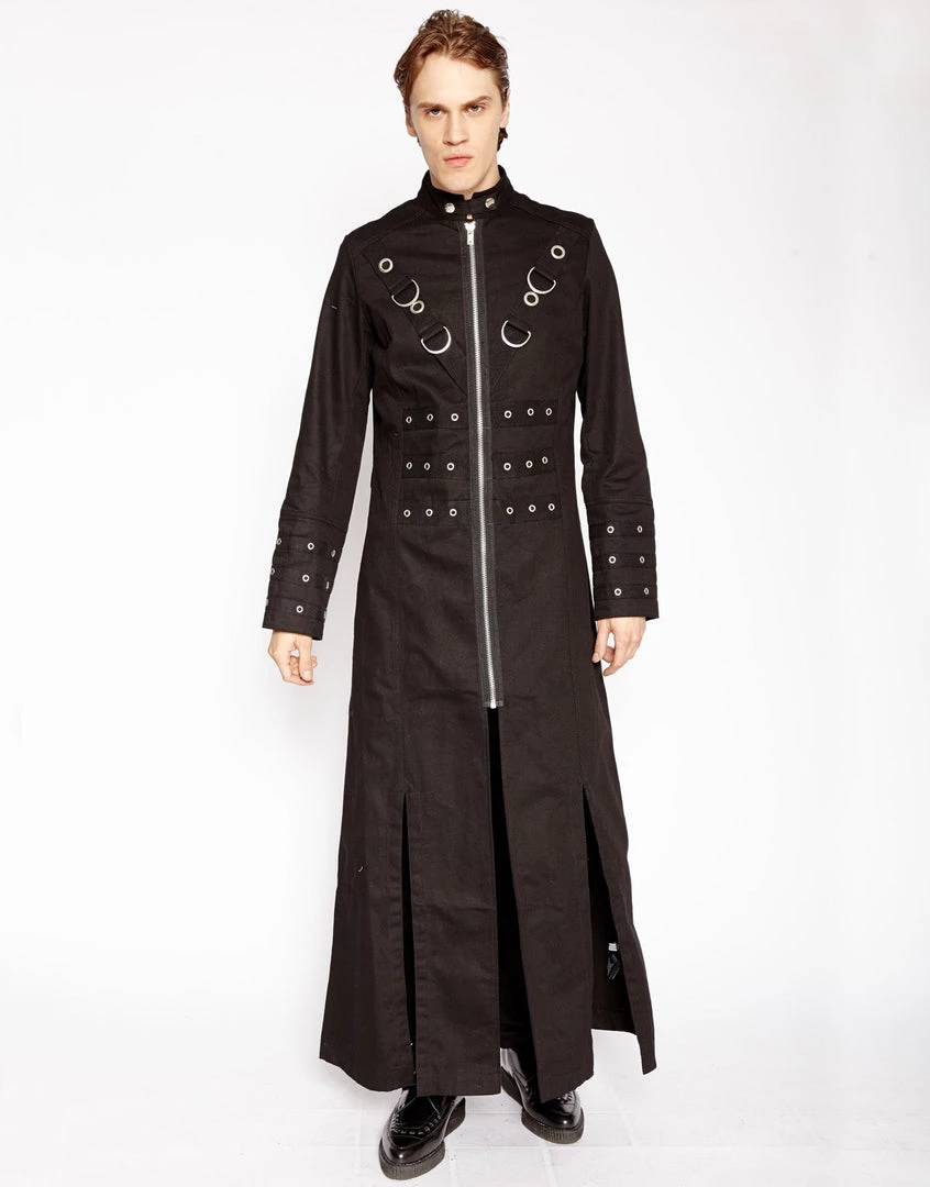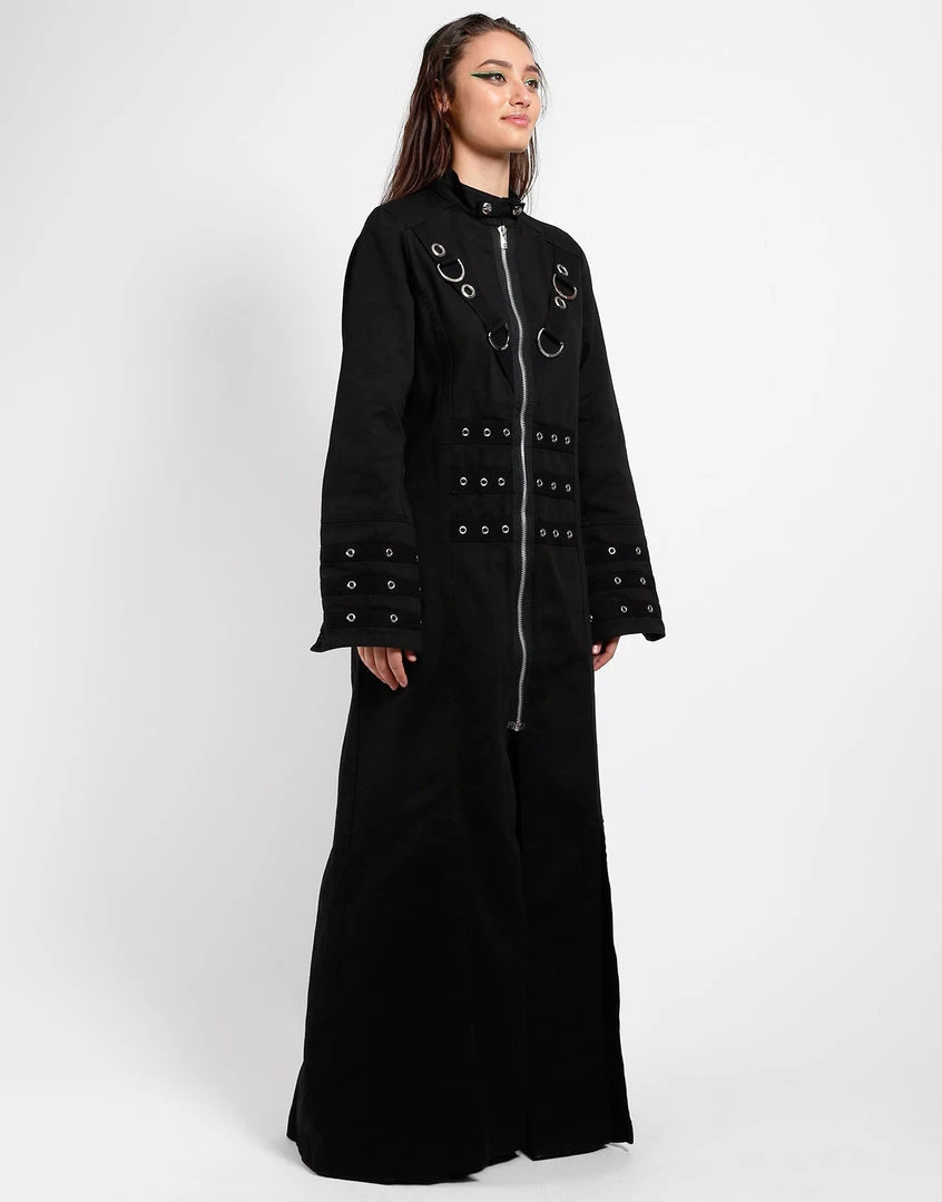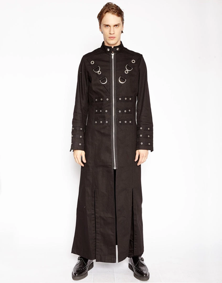 You’re the master of your universe. This ankle length trench coat features silver D-rings, a zip up front, and grommet details on the front, back, and sleeves.