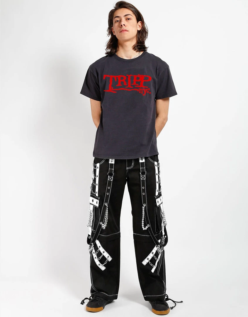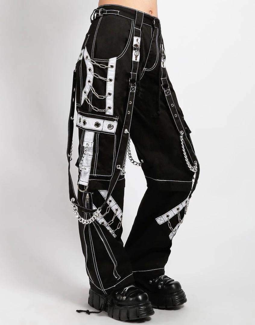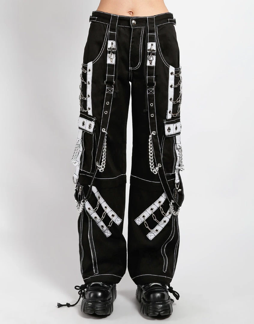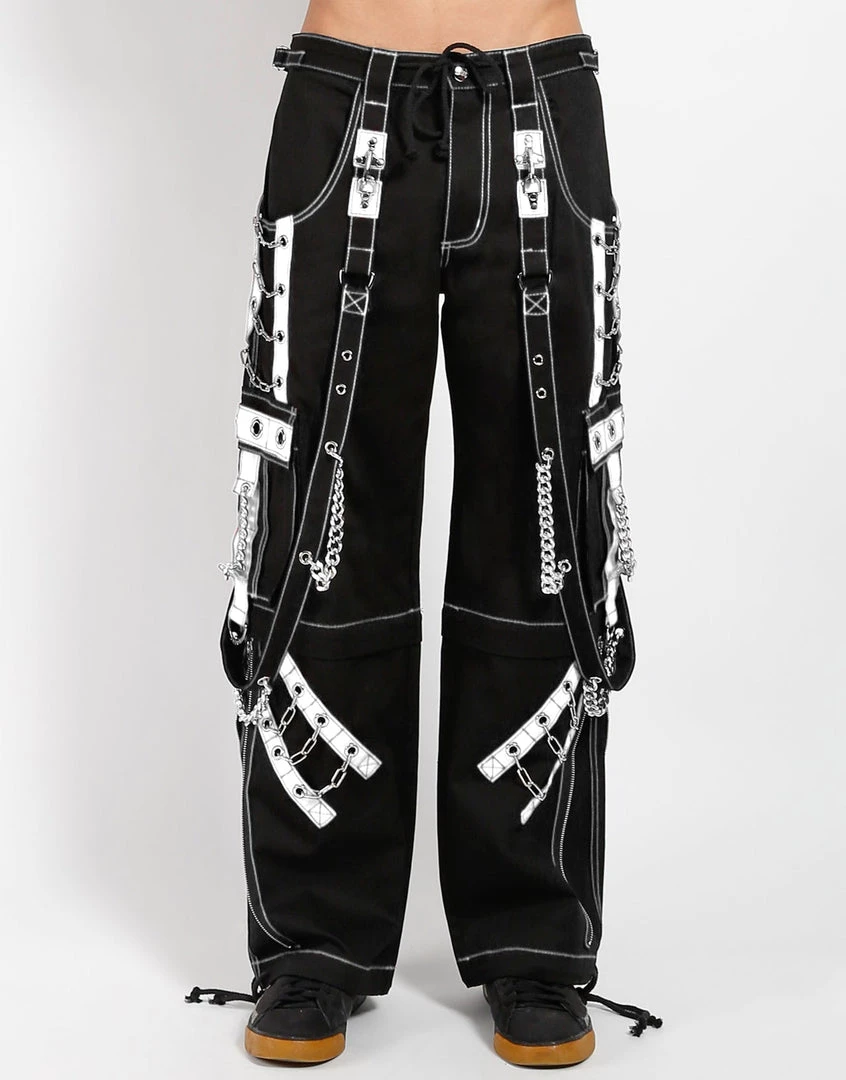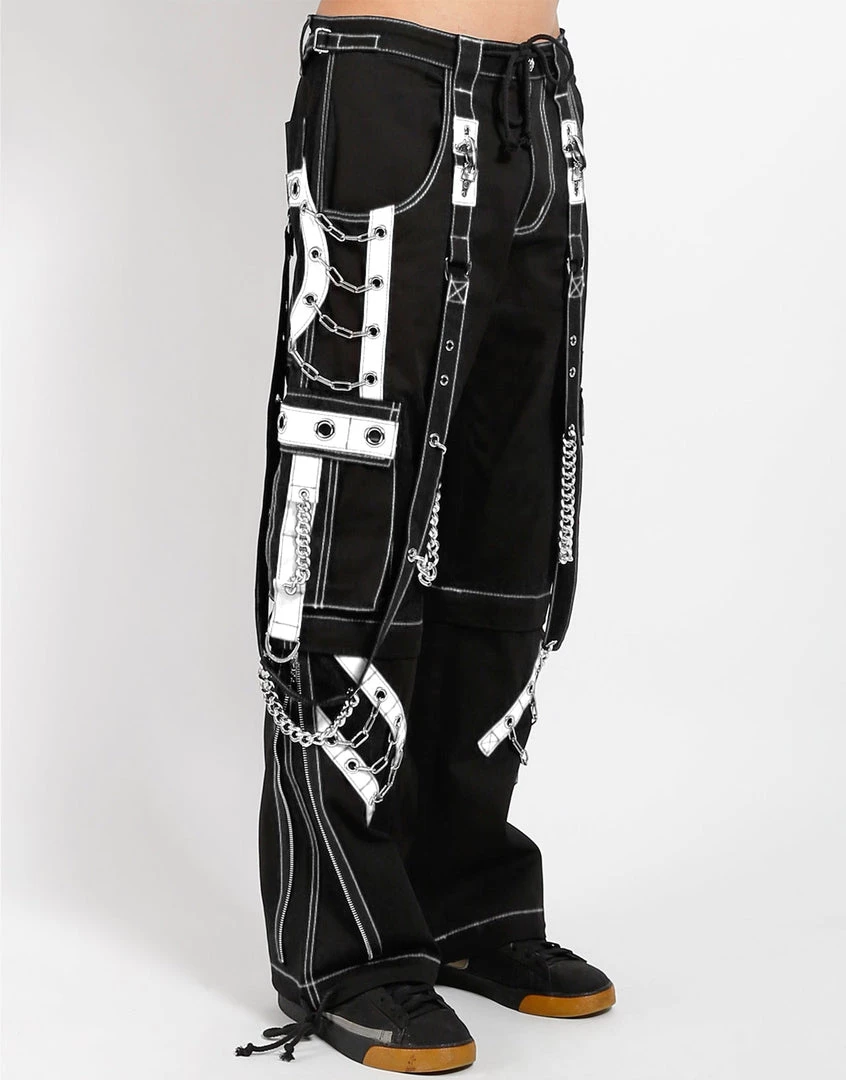 Accept no imitations! From the originator of all things DarkStreet, these black pants feature pants zip off into shorts, white stitching, removable straps, adjustable ankles, D-rings, clasps, and deep pockets.