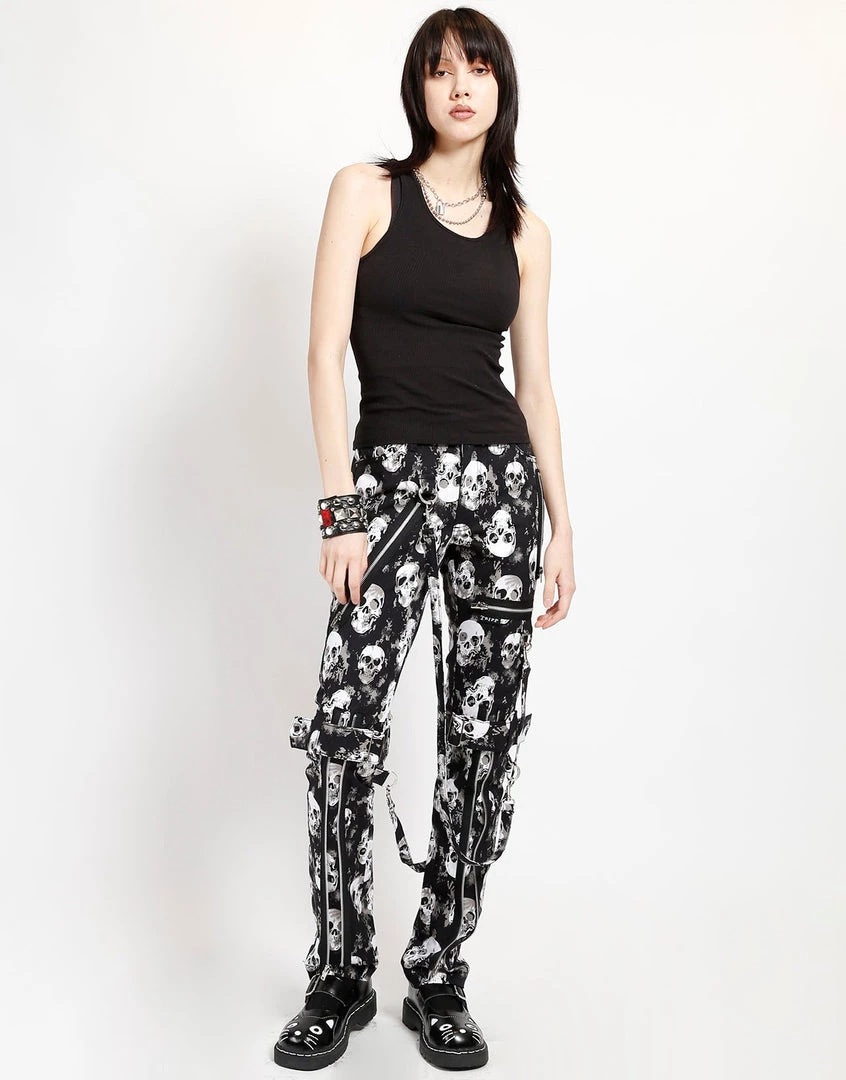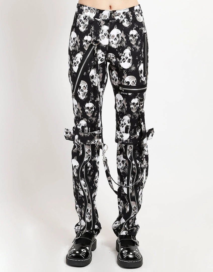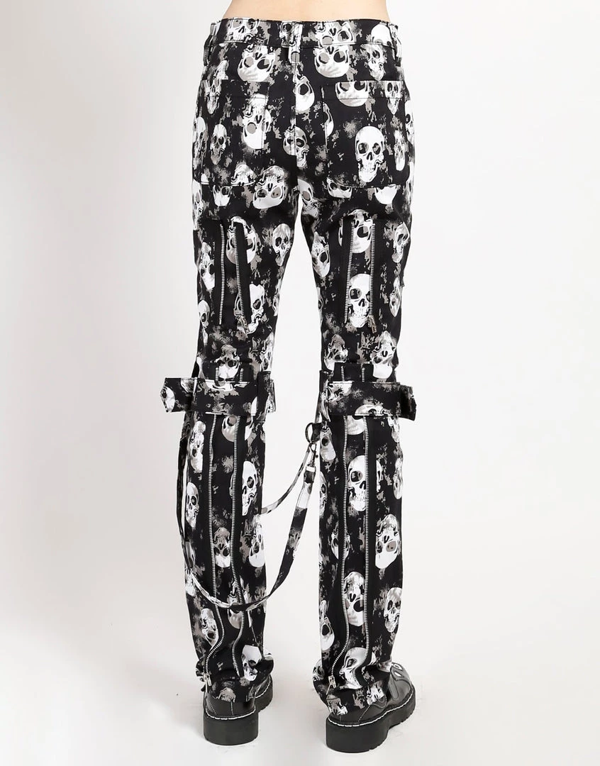 These skull print bondage pants were made for rocking out in. Our classic pants feature removable bondage straps and zipper details. Pant legs can be zipped for a change in fit, topped off with a zip fly and button closure.
