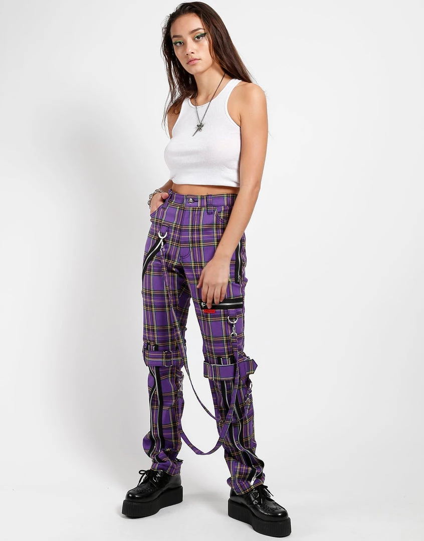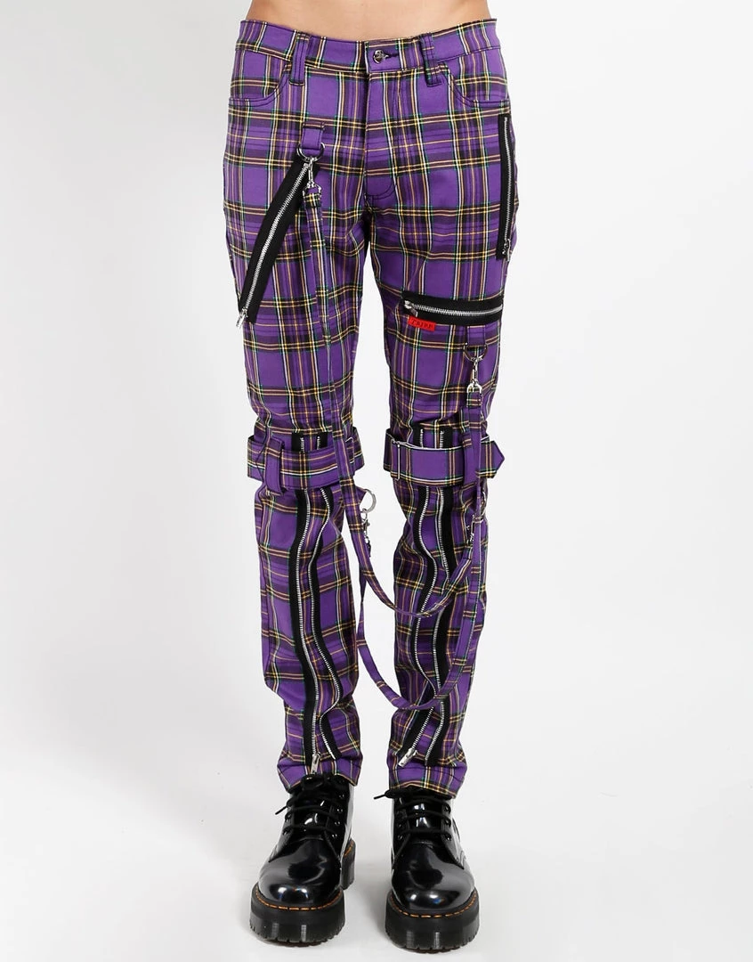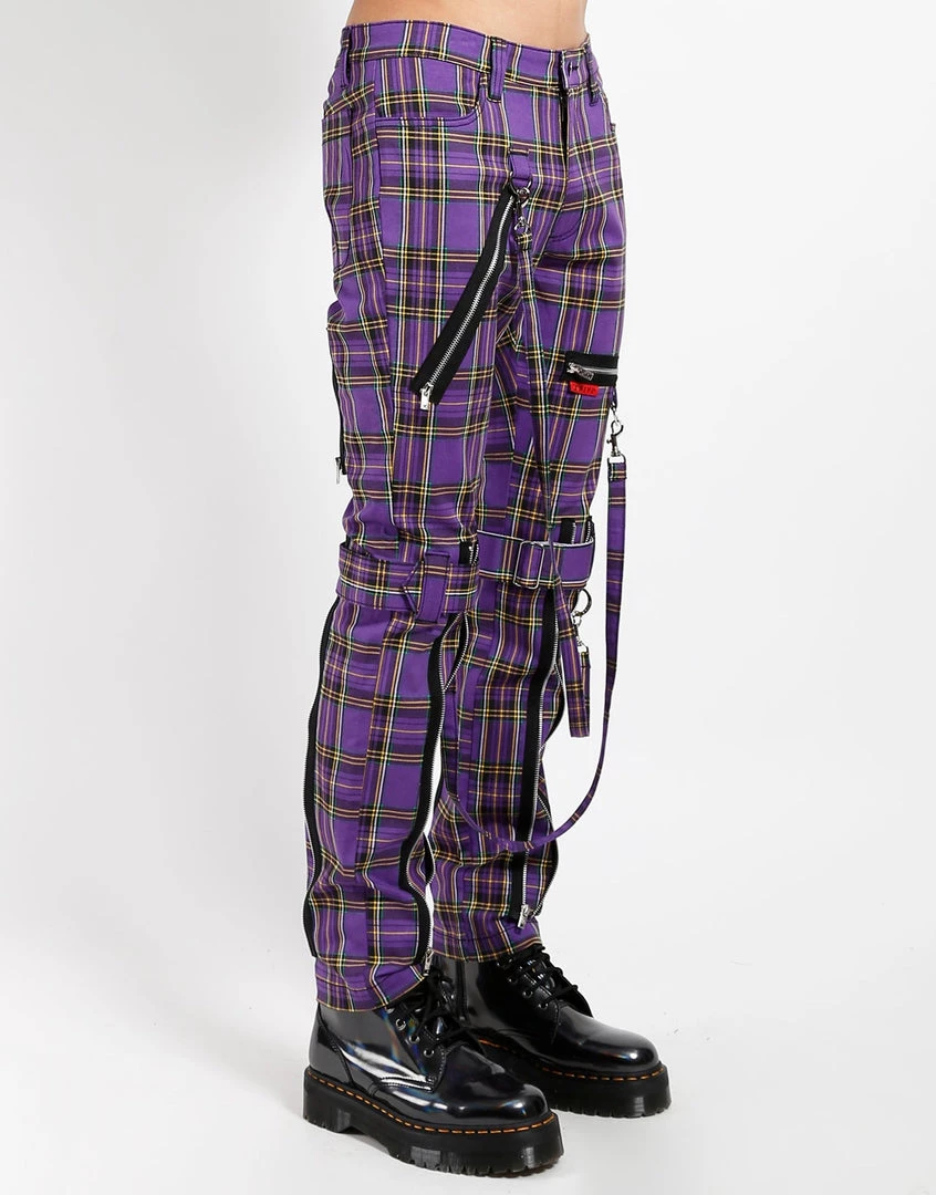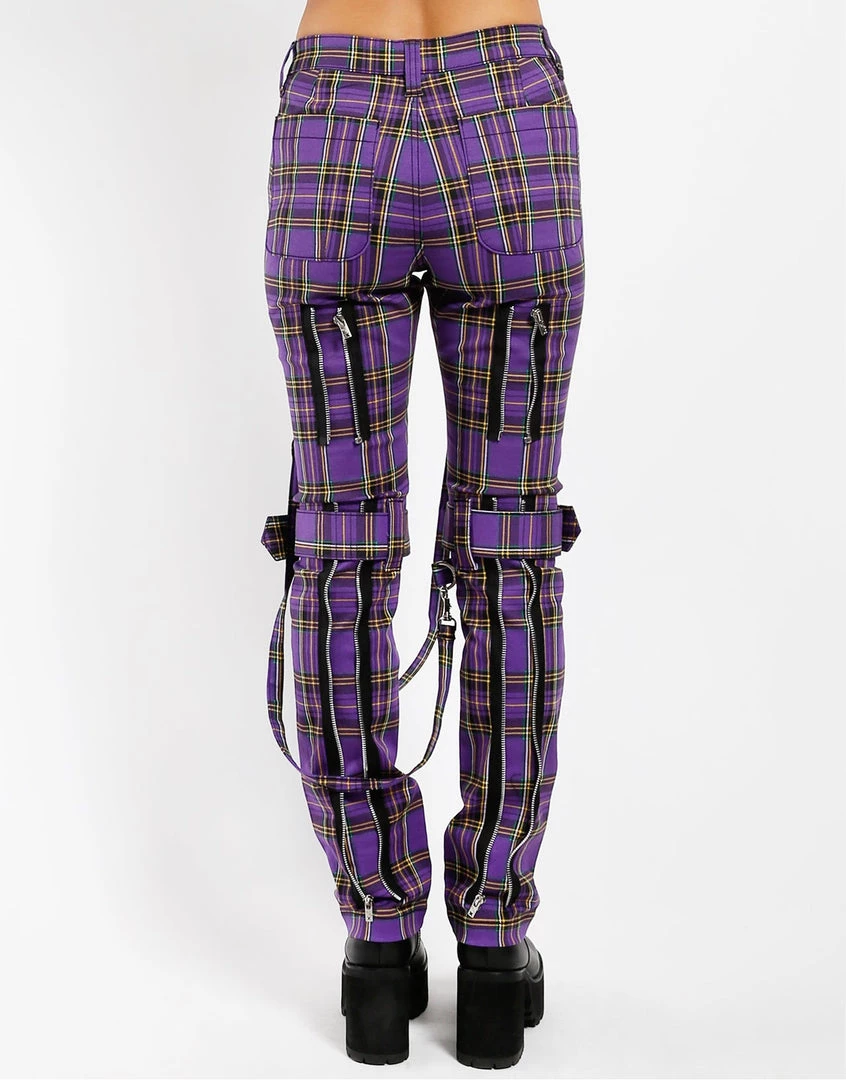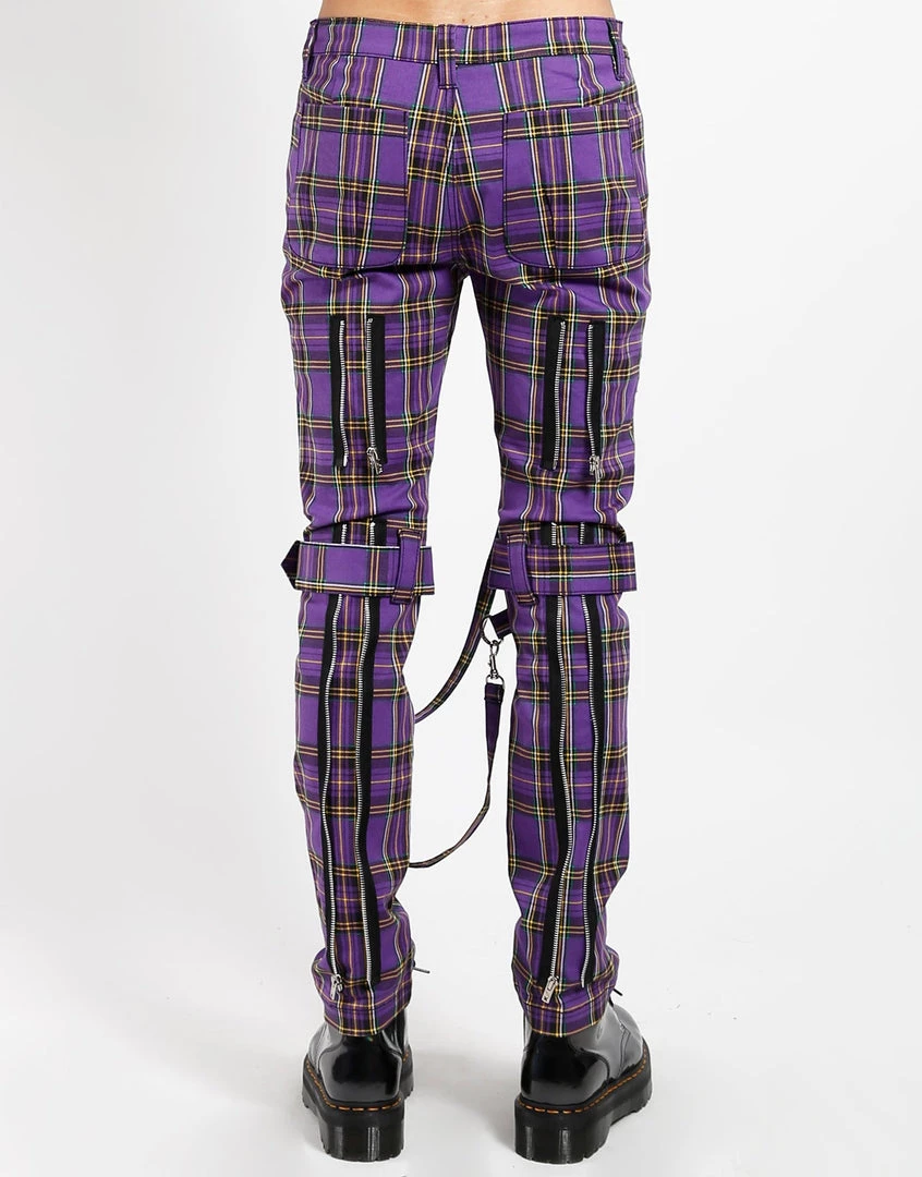 These violet plaid pants were made for rocking out in. Our classic pants feature removable bondage straps and zipper details. Pant legs can be zipped for a change in fit, topped off with a zip fly and button closure.