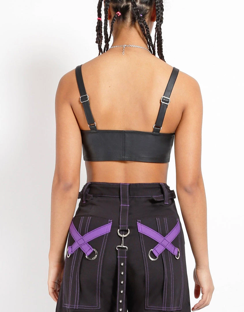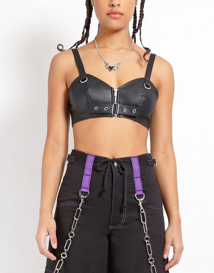 Va-va-voom! This killer bustier shirt will have your body smokin! a vegan leather front top with a belt detailing on the bust & zipper in the front
