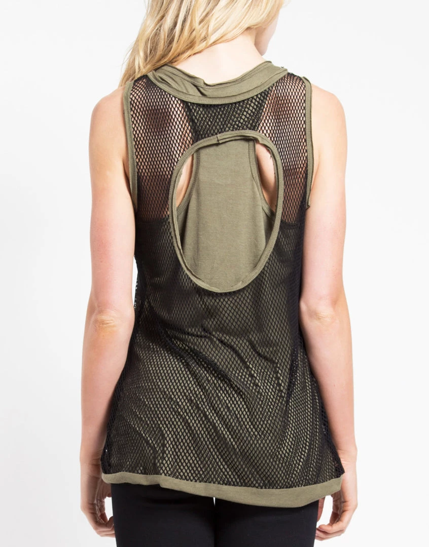 Nothing but net! Score extra points in this layered fishnet knit tank. Features a soft tank with racerback and cutout fishnet overlay with scoop neckline.