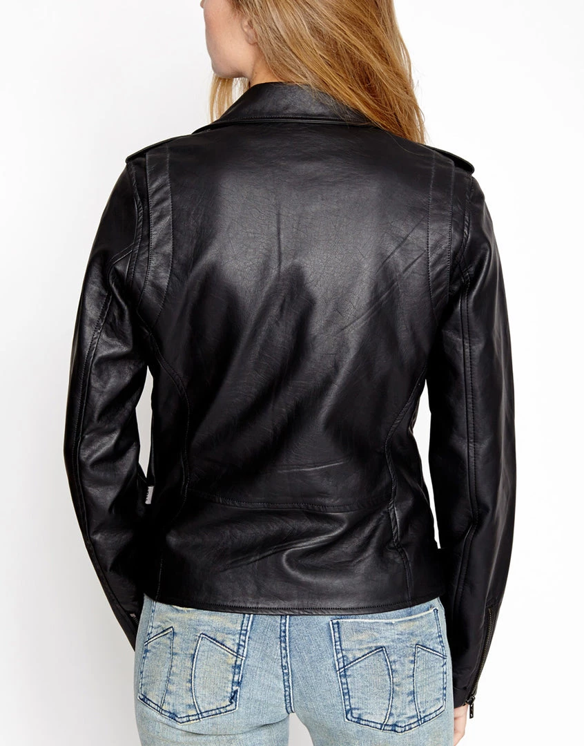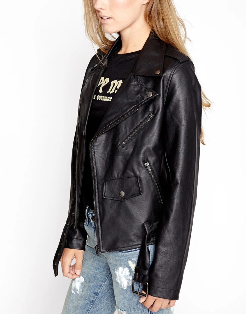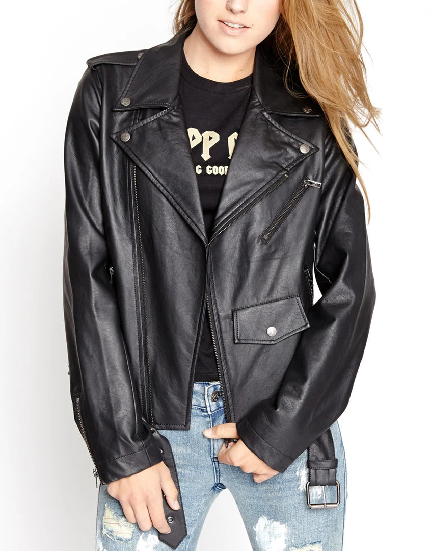 Release your inner punk rock biker babe with this classic! This fitted jacket has classic moto detailing like zip front, pockets & sleeves, snap lapels & front pocket and adjustable belt at the bottom.