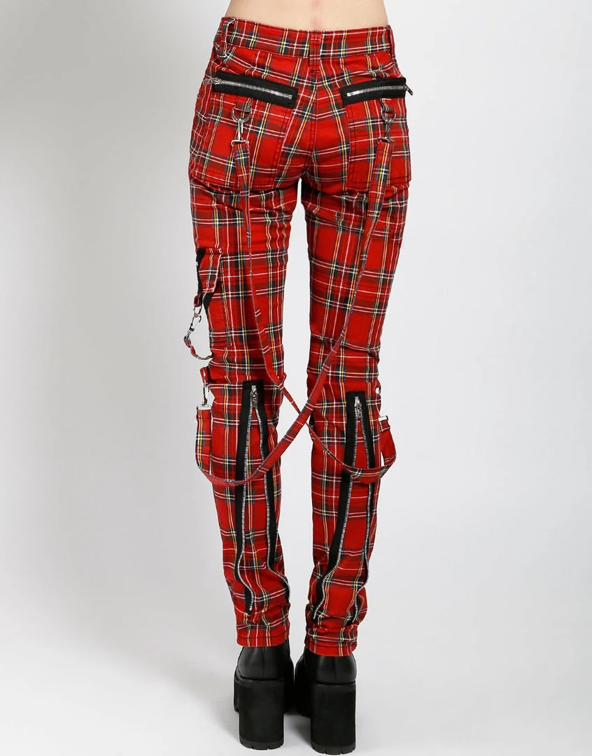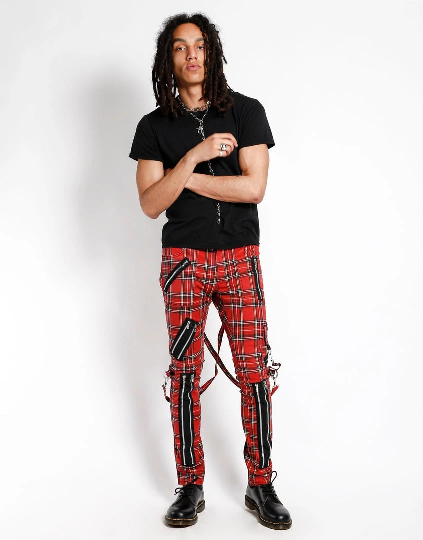 These red plaid pants were made for rocking out in. A punk rock wardrobe wouldn’t be complete without our classic slim leg pants with removable bondage straps and zipper details. Pant legs can be zipped for a change in fit, topped off with a zip fly and button closure.