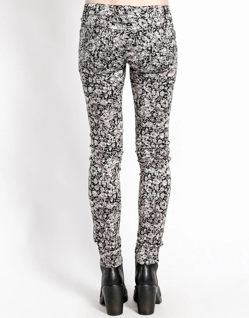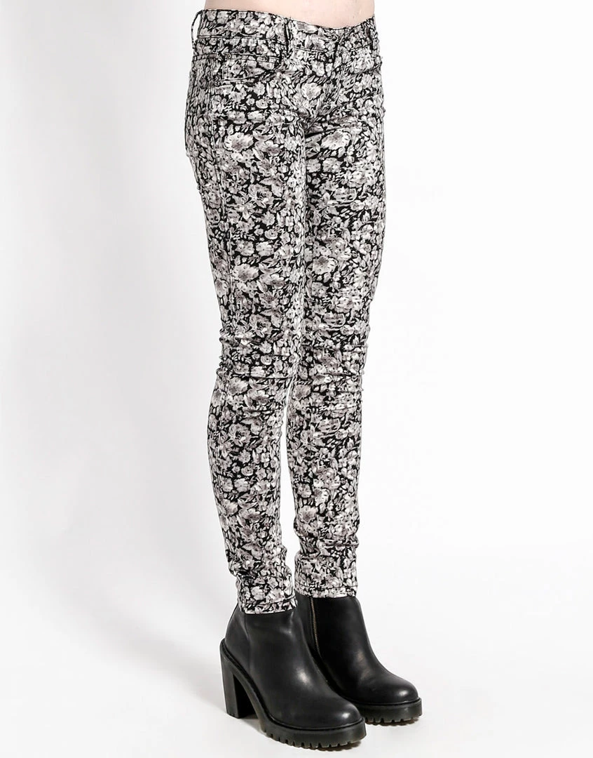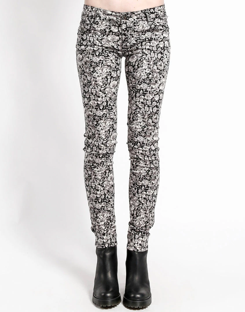 Classic five-pocket super skinny fit with all over floral print, t-back pockets, skull rivets, zip fly & button closure.