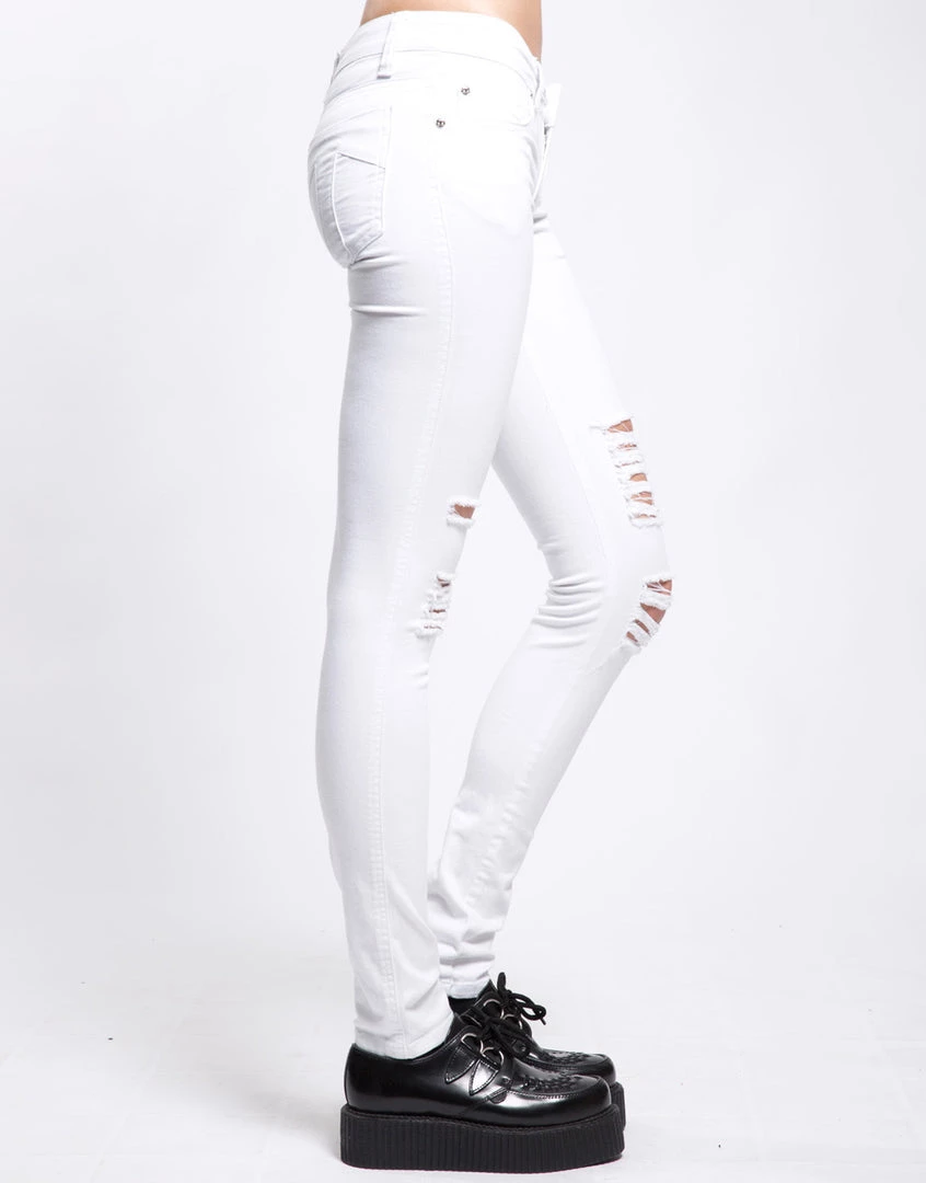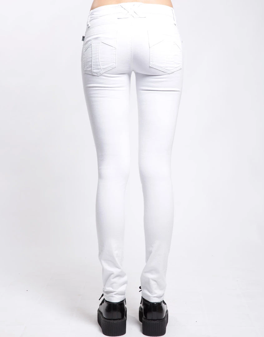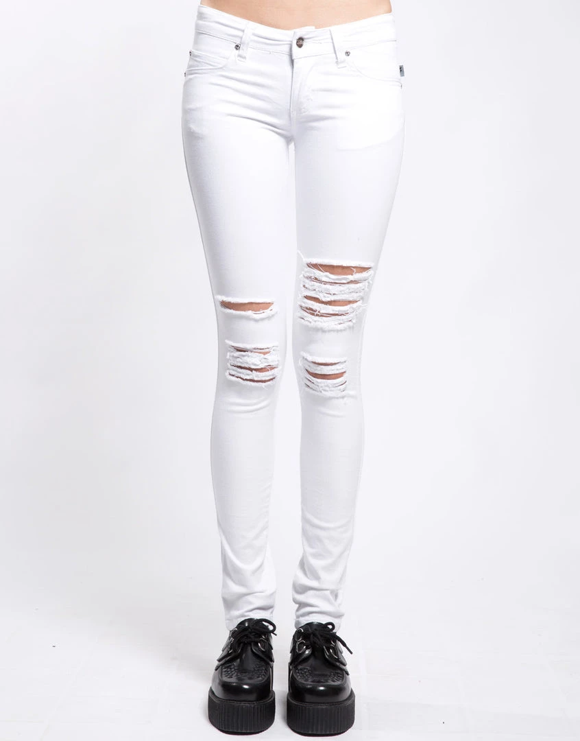You can always count on a classic! These ultra skinny jeans featuring tough tears at the knee, a t-back design and skull rivets are a Tripp NYC staple. Five pocket fit, zip fly & button closure.