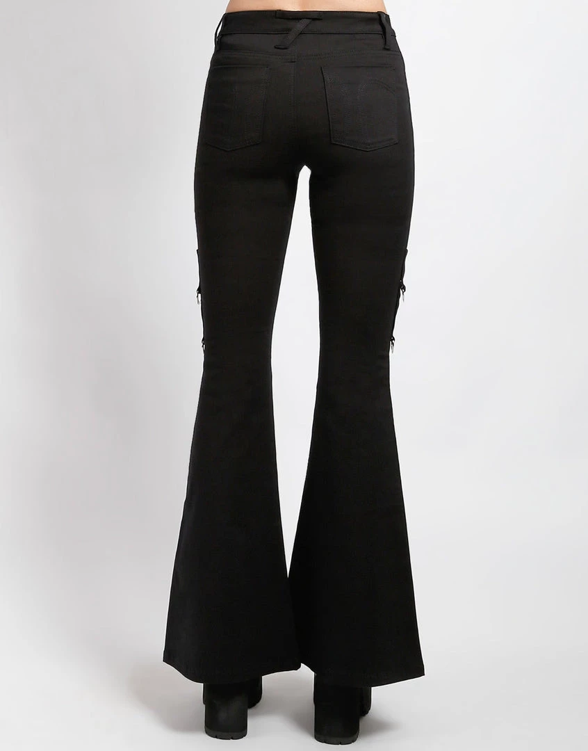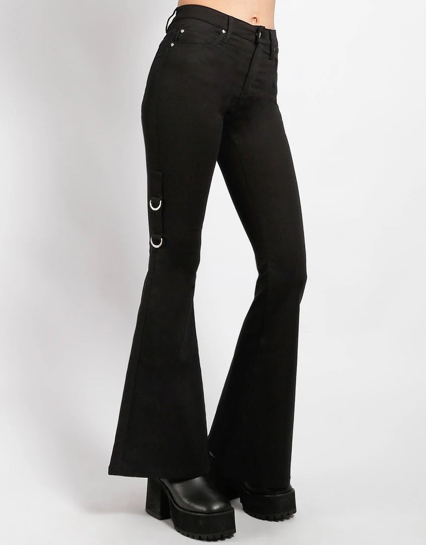 Groovy baby! Give your skinny jeans a rest; it’s time to break out the bell bottoms. These flares feature a 10.5″ rise, silver skull rivets, a zip fly and button closure, and stitched T-Back pockets. Features 2 D-Rings on the side leg.