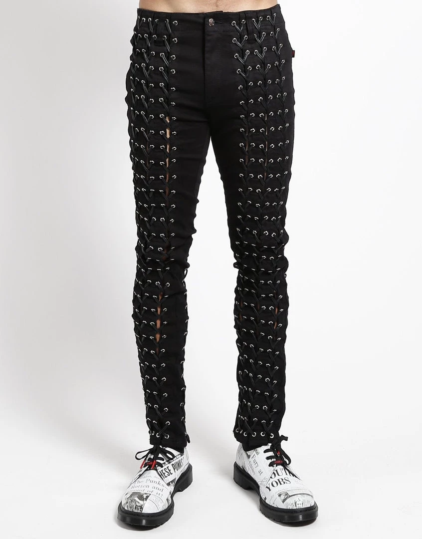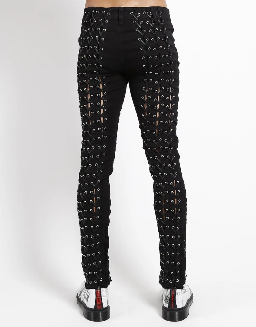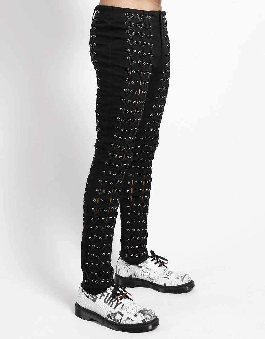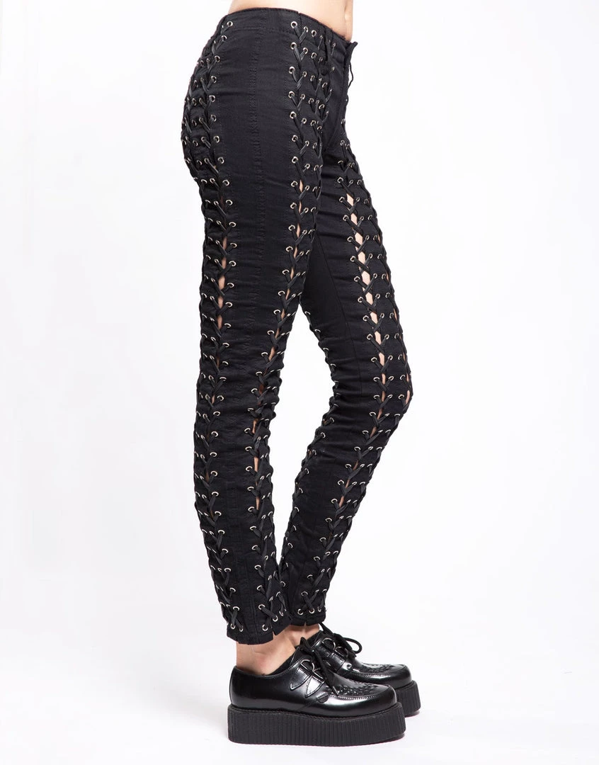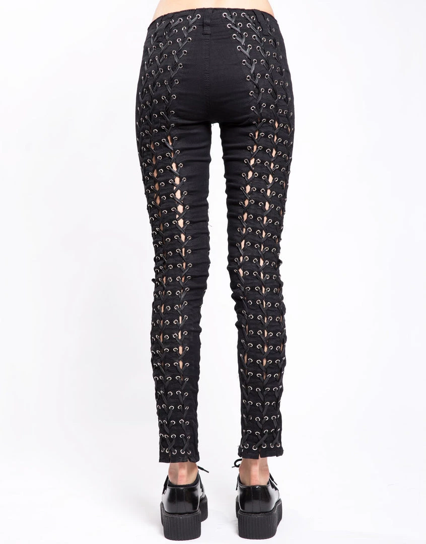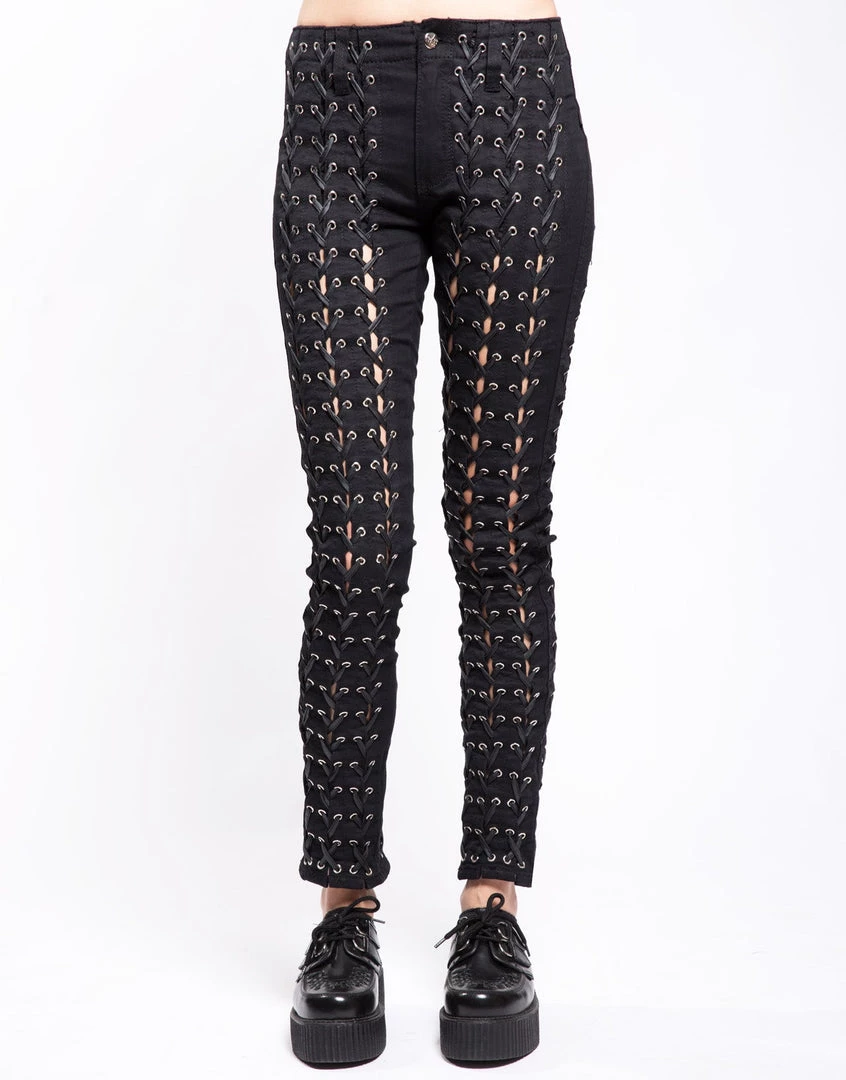 Armour up in these limited edition, all-over lace up skinnies from our archive! Features faux leather laces and silver grommets all over revealing flashes of skin. Includes short lining, 10 inch rise, silver hardware, and button and zip fly closure.