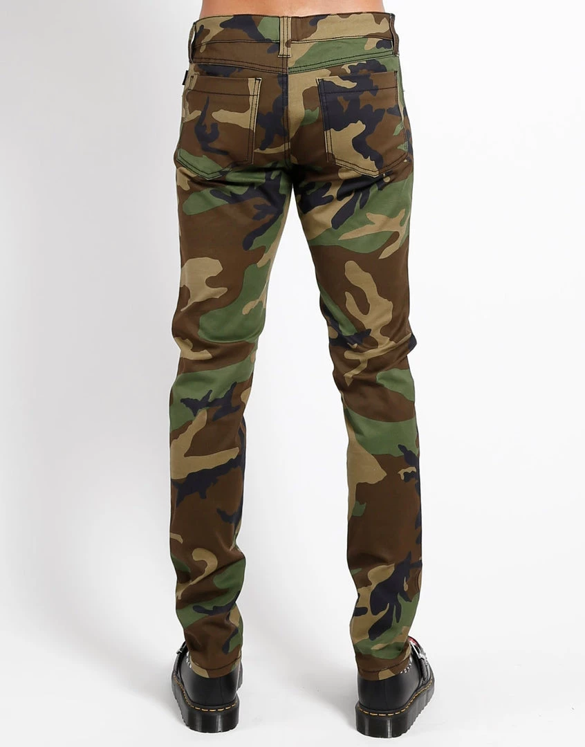 Our signature men’s skinny printed rocker jean in camo features classic five-pocket slim fit stretch denim with silver rivets, zip fly & button closure.