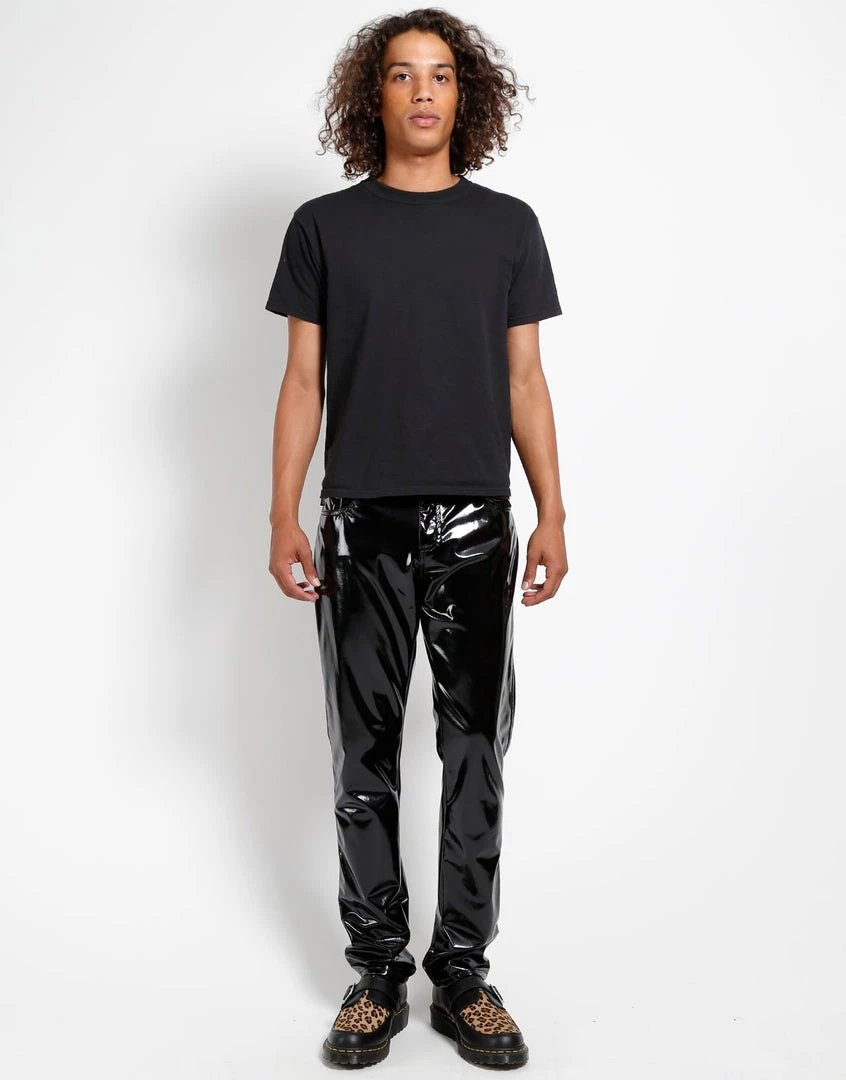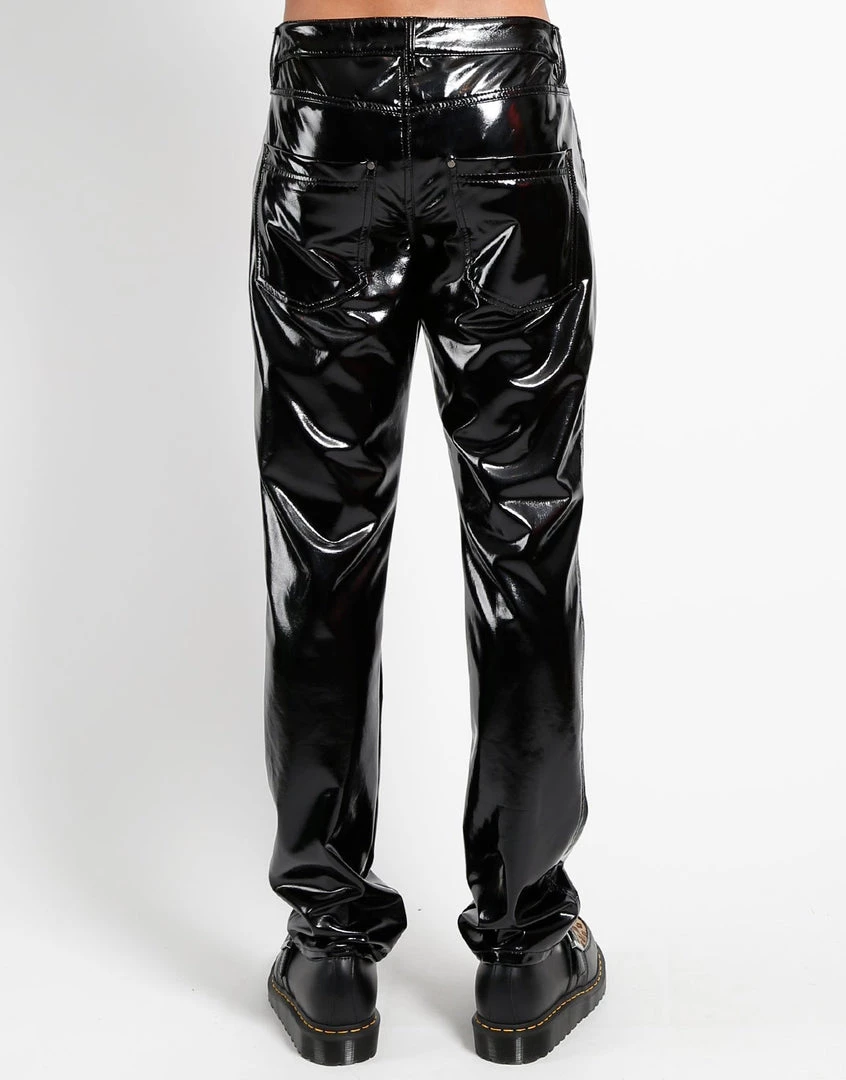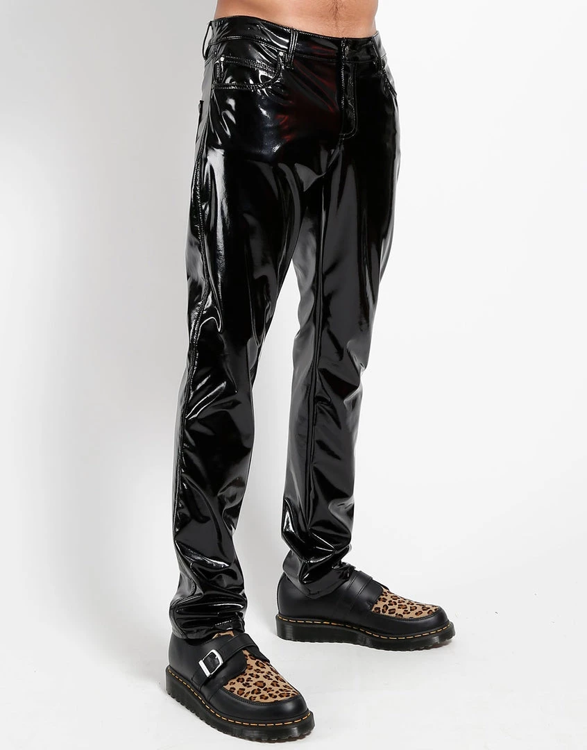 Pure rock n’ roll, these slim cut shiny vinyl pants are sure to turn heads