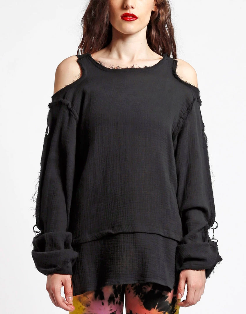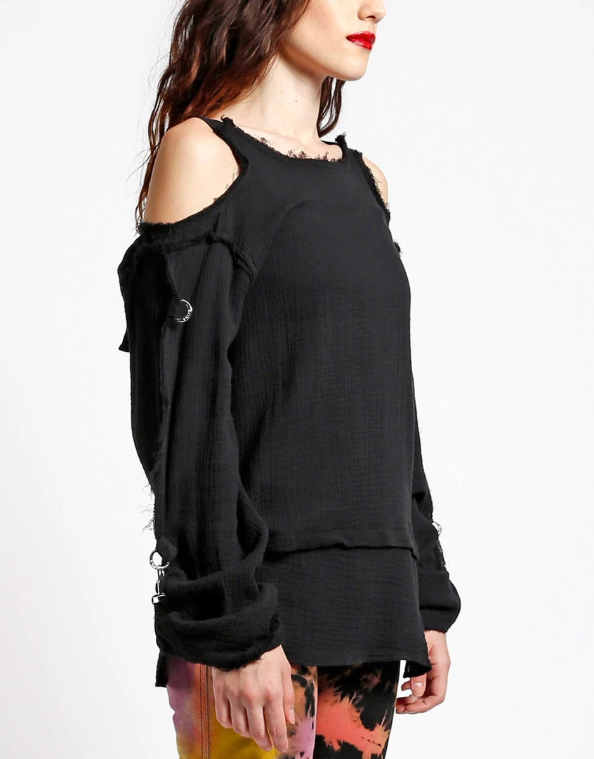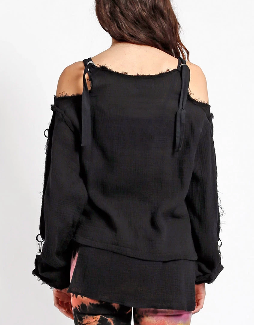Wearing this tattered punk rock top proves you’ve got attitude and the style to match! This gauzy long sleeve has cutout shoulders with adjustable straps, fold over sleeves with a hook closure, d-ring details and dropped front & back.