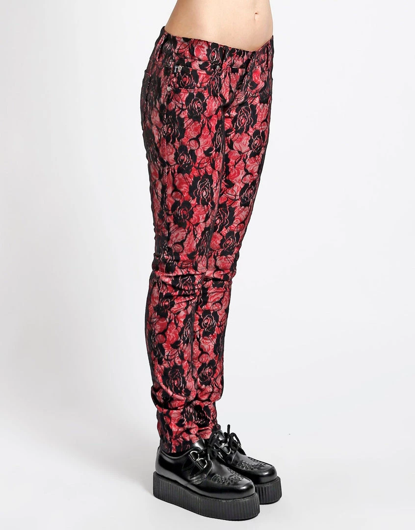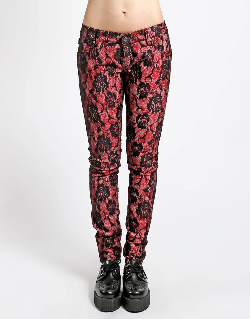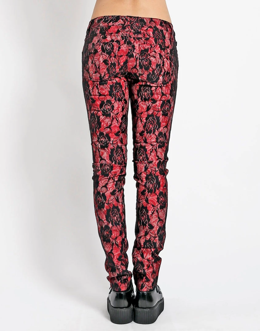 Black Rose Lace overlay on red rose printed skinny pants