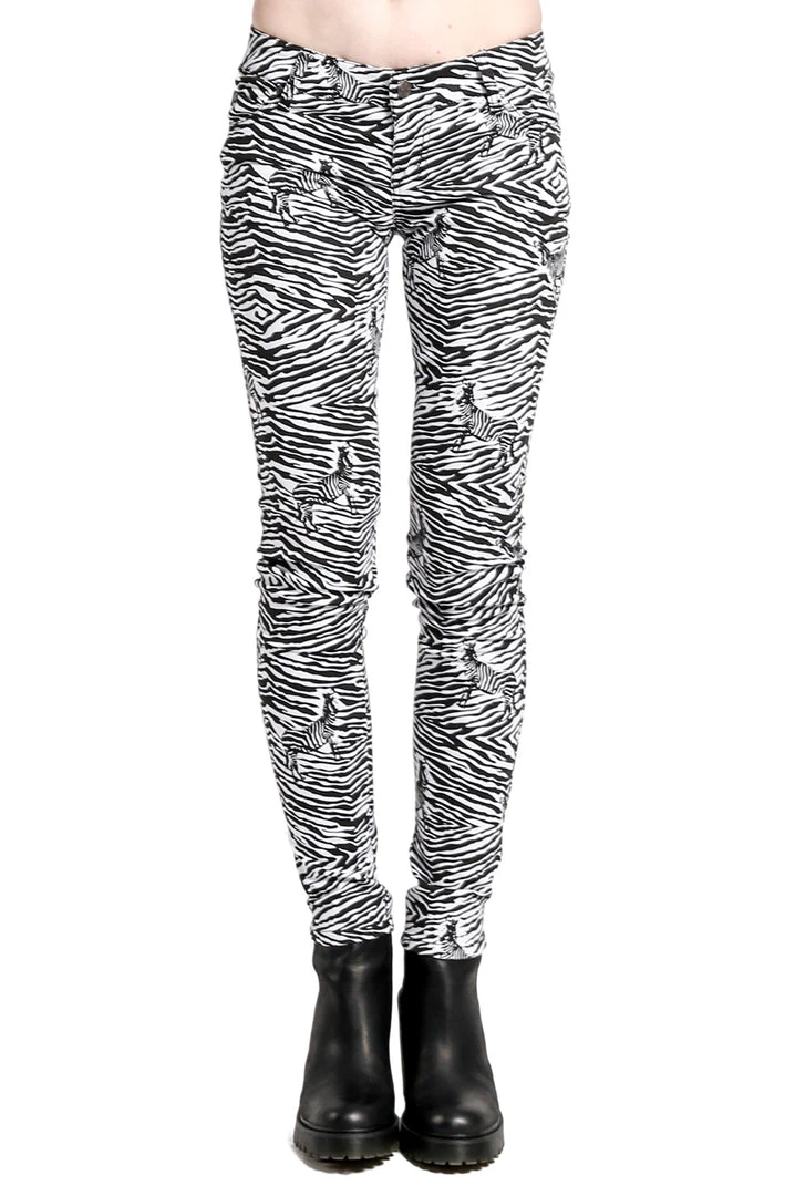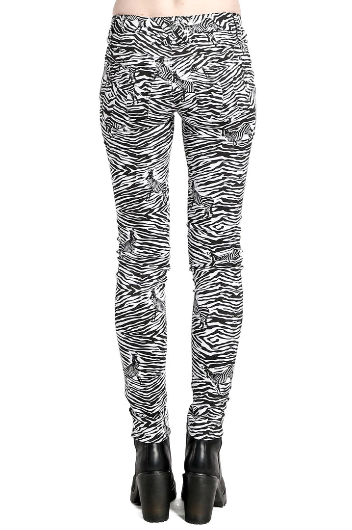 You’ll do anything but blend into the crowd in our zebra skinnies! Classic five-pocket super skinny fit with all over zebra print, t-back pockets, skull rivets, zip fly & button closure.