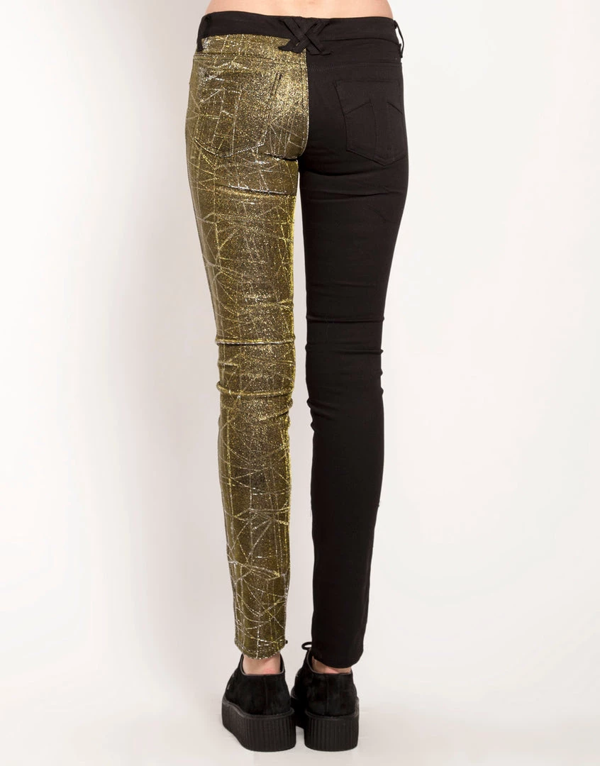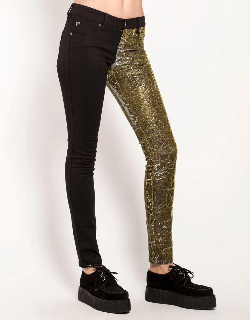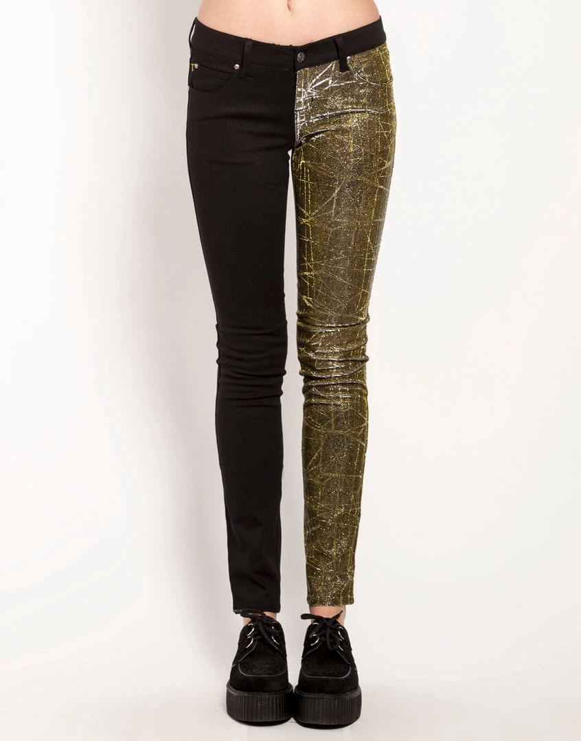 Don’t let the world dull your shine! Sparkle in these multidimensional, split leg, high-shine low-rise skinny fit jeans with five pockets, skull rivets, T-back pockets, and a zip fly and button closure.