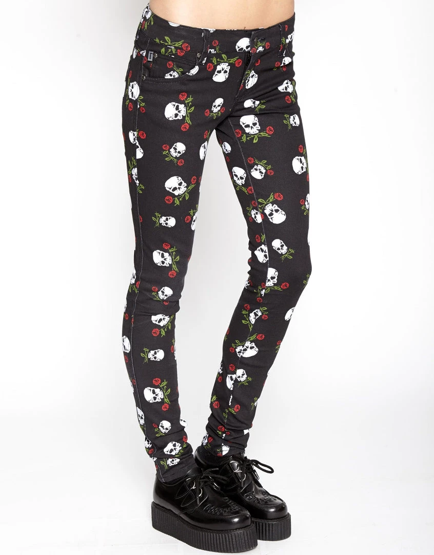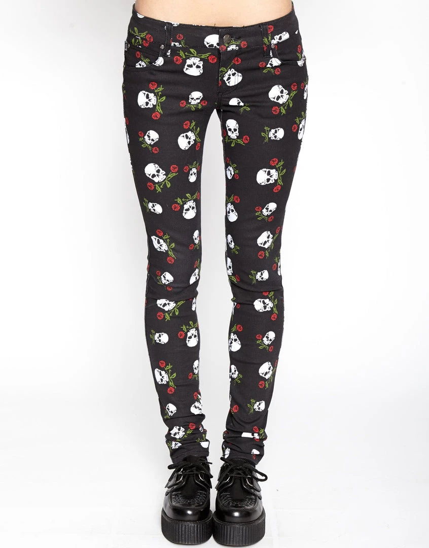 These pants are killer! Classic five-pocket super skinny fit with all over skull & rose print, t-back pockets, skull rivets, zip fly & button closure.