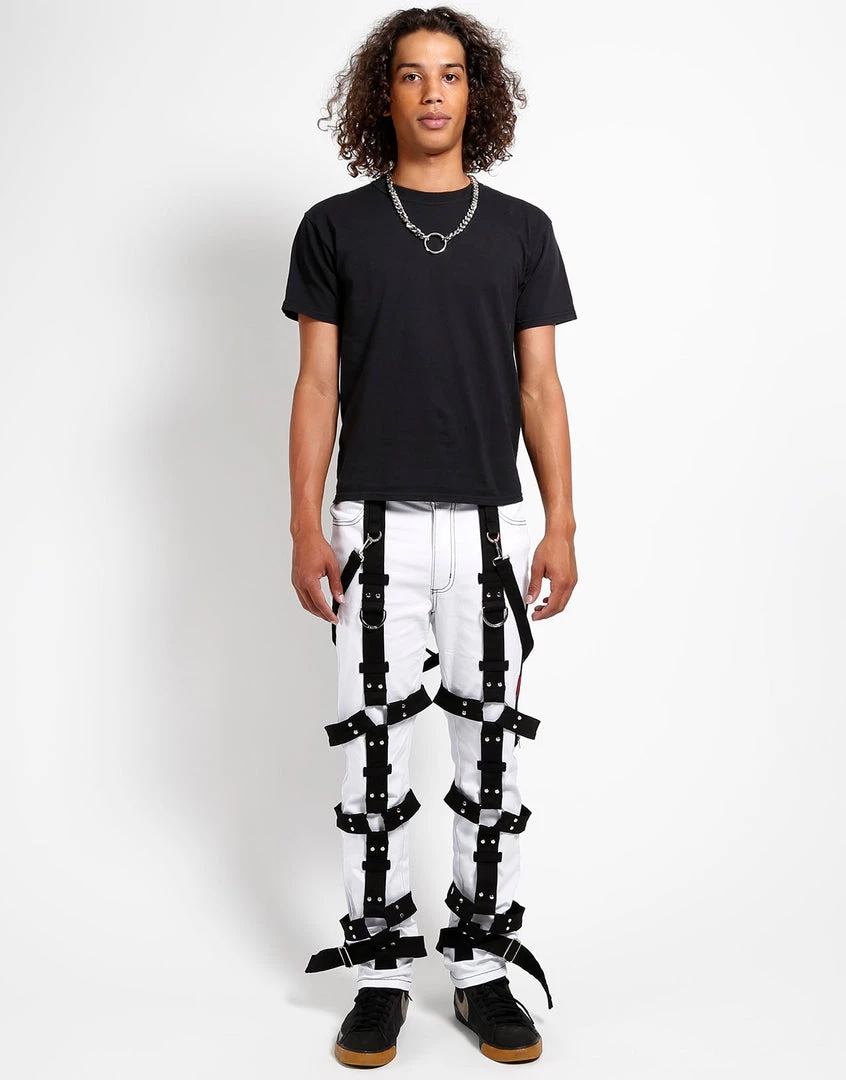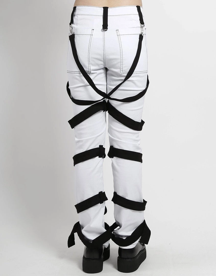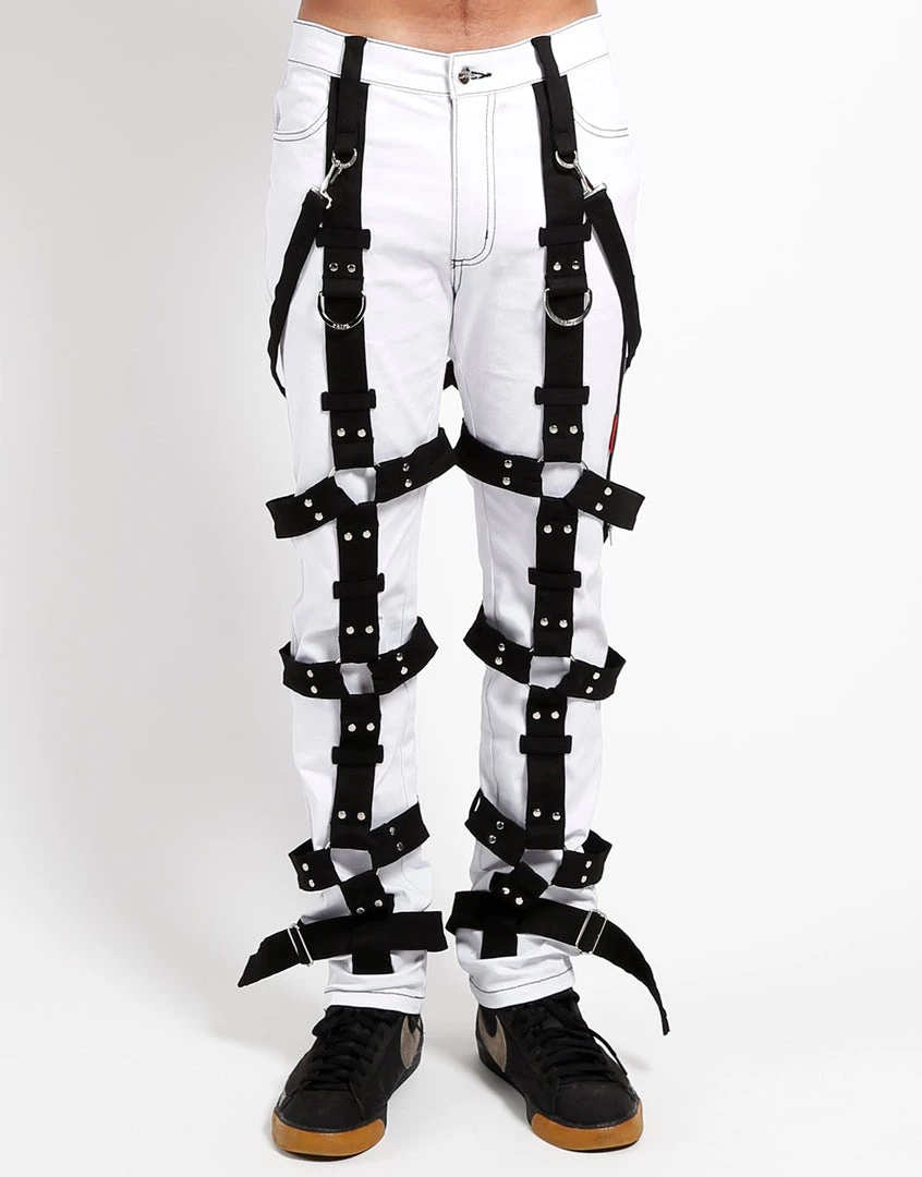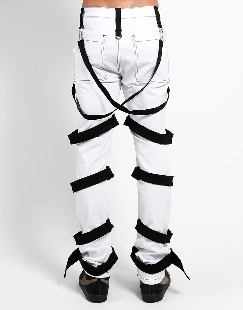 Strap yourself in for this crazy ride! Slim fitting white and black straps bondage pants with stretch harness straps and zipper and button closure. Slim 4 pocket bondage pant with harnesses, d-rings, and removable bondage straps.