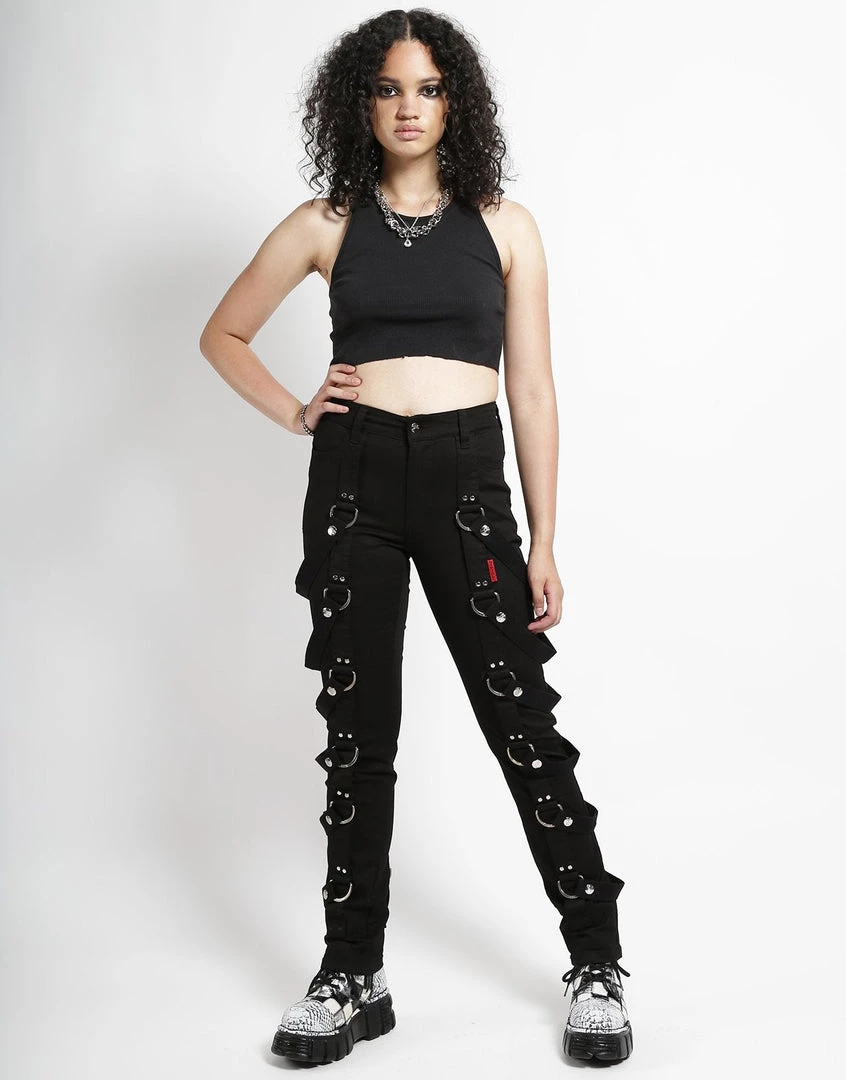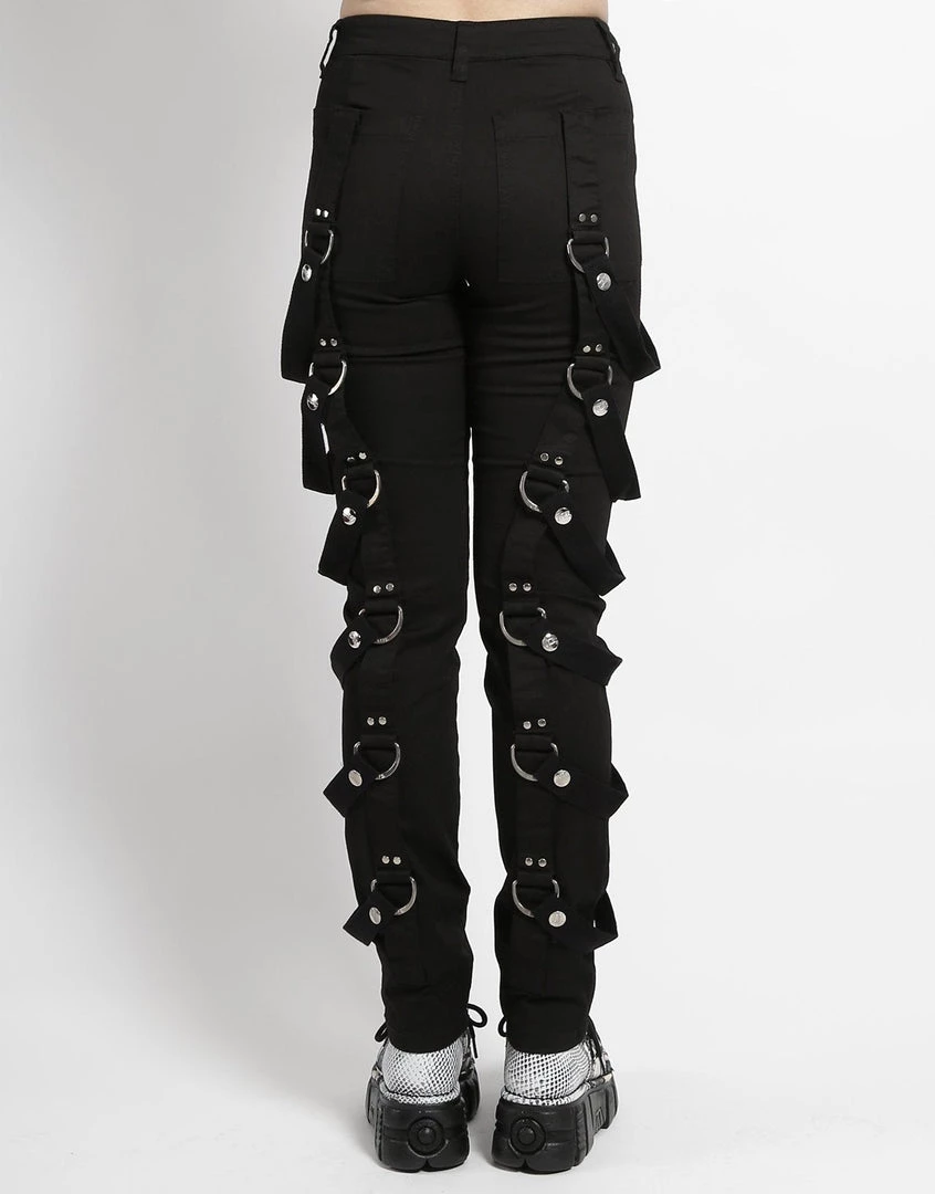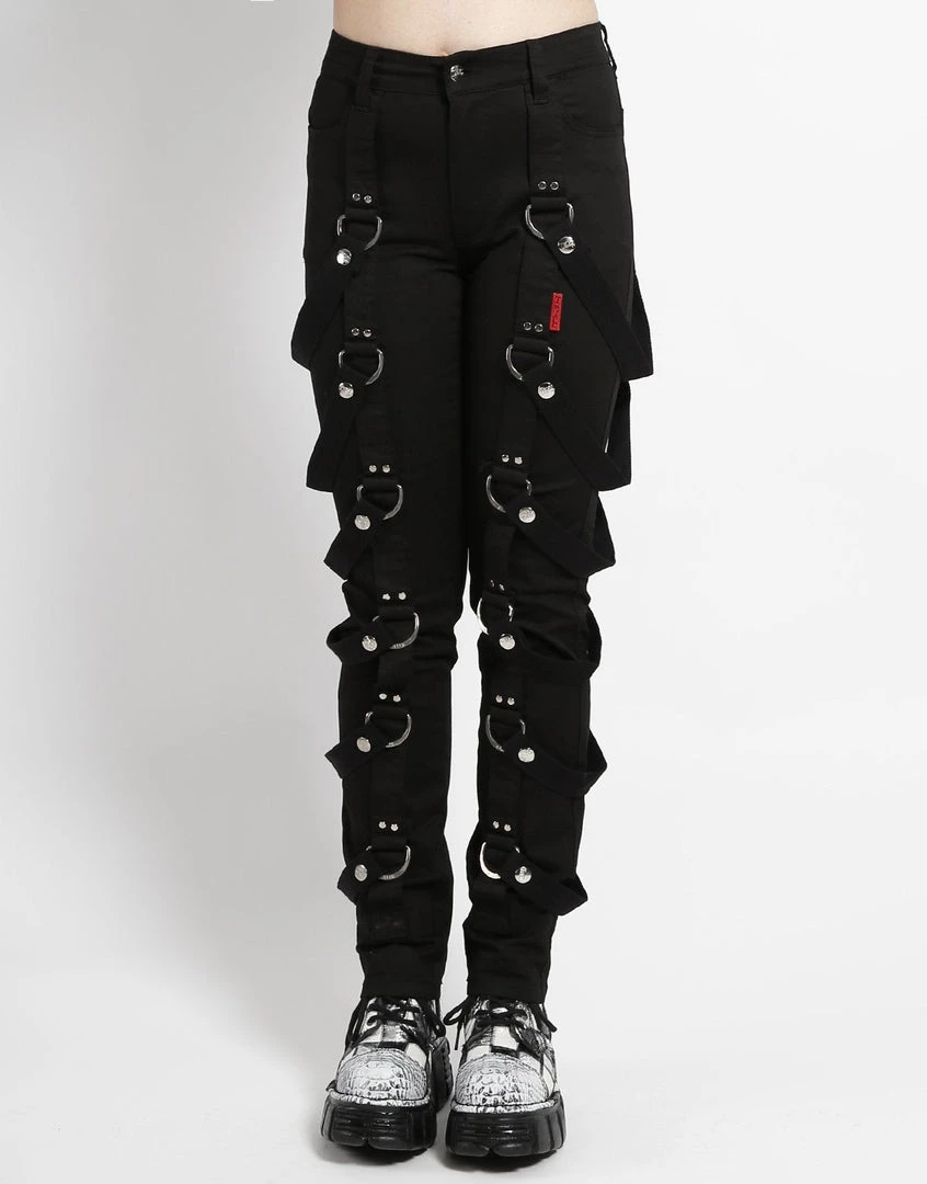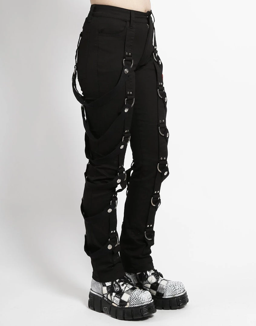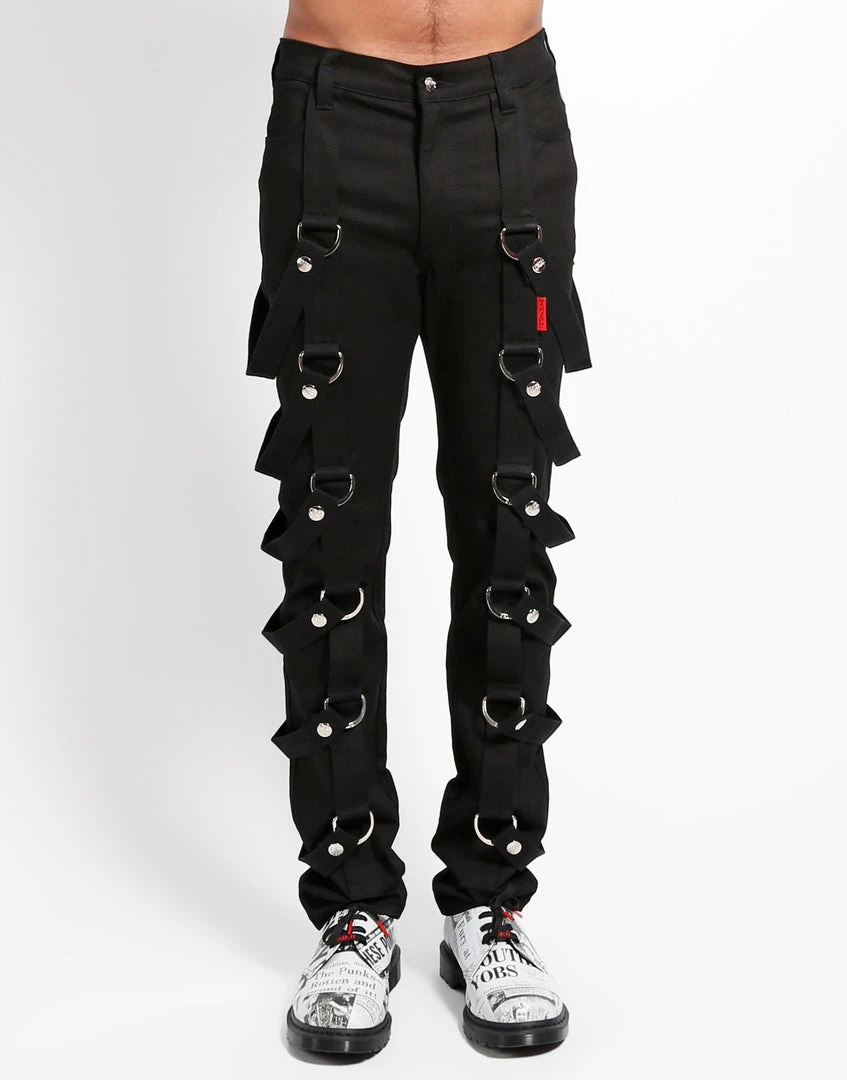 Slim 4 pocket bondage pant with d-rings, removable bondage straps and TRIPP NYC logo snap button details.