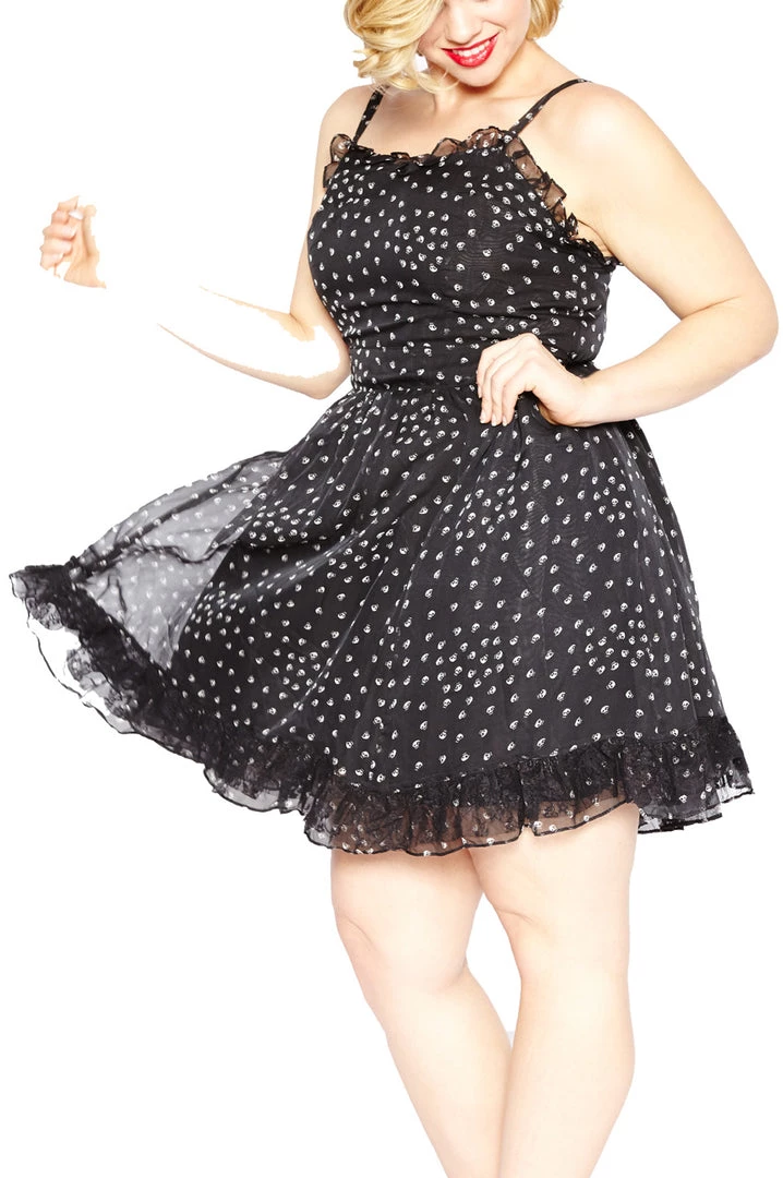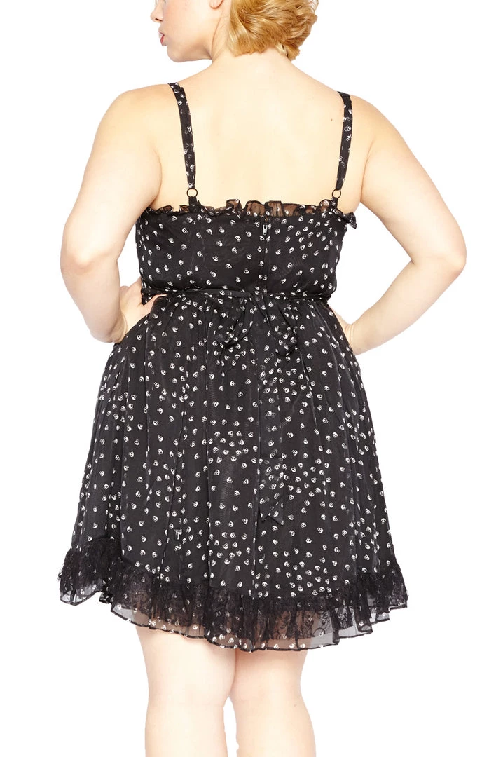 Sprinkle a little skull into your life with this all over tiny poison skull printed dress featuring a ruffled hem, adjustable straps, and an empire waist with a tie back for the perfect fit.