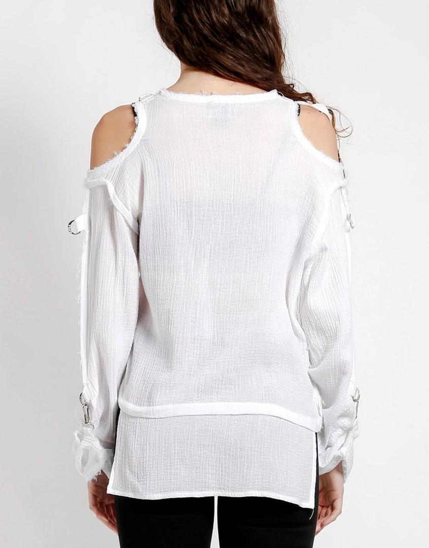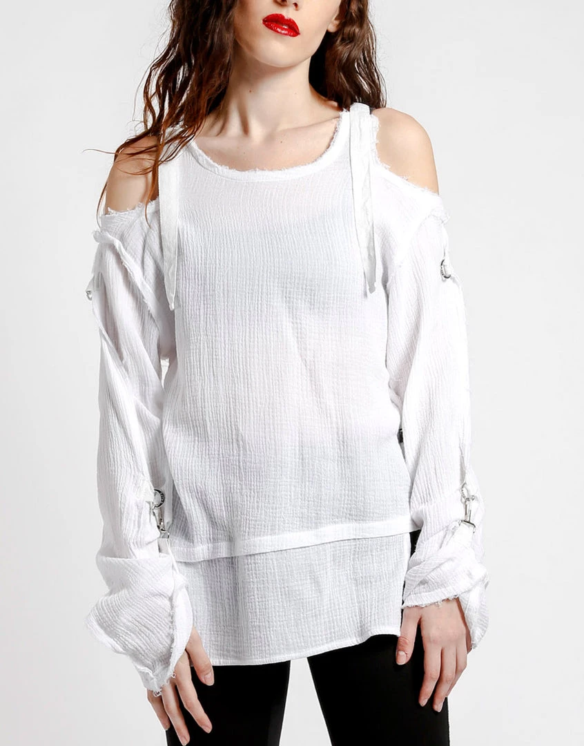 Wearing this tattered punk rock top proves you’ve got attitude and the style to match! This gauzy long sleeve has cutout shoulders with adjustable straps, fold over sleeves with a hook closure, d-ring details and dropped front & back.