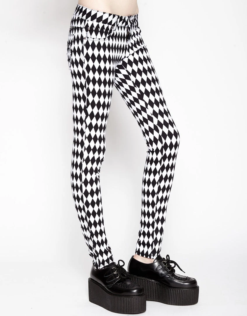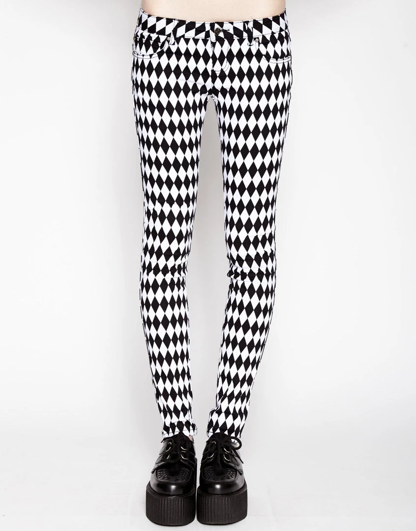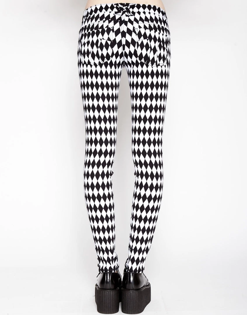 Just think of all the mischief you could create in these topsy-turvy t-back skinnies! Classic five-pocket super skinny fit with all over harlequin print, t-back pockets, skull rivets, zip fly & button closure.