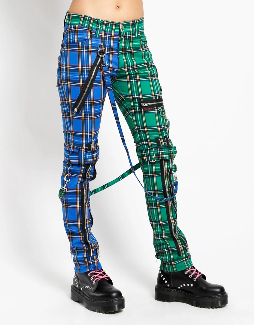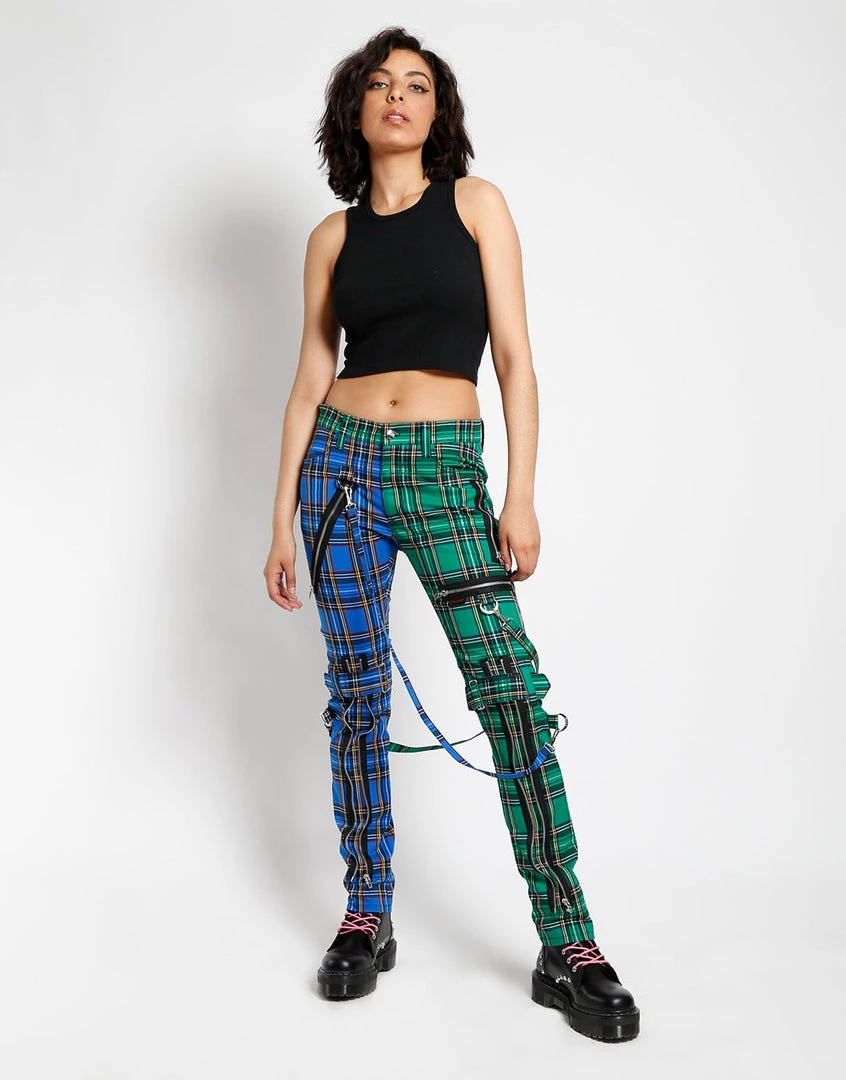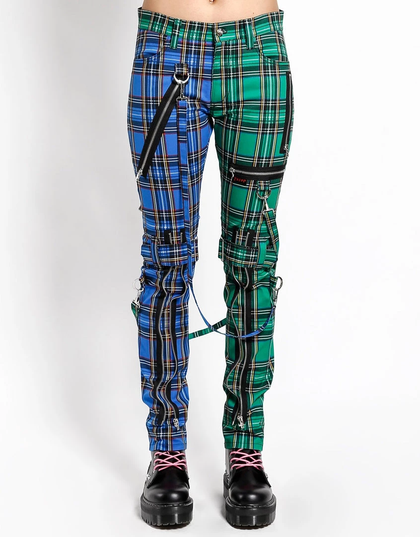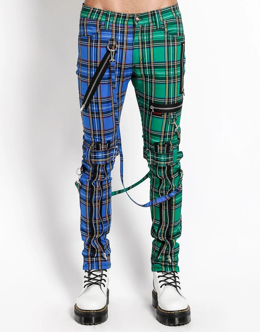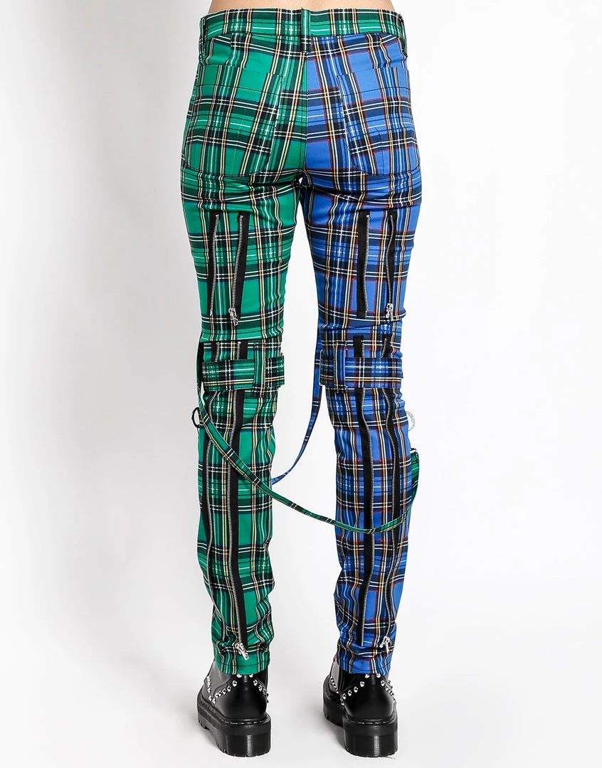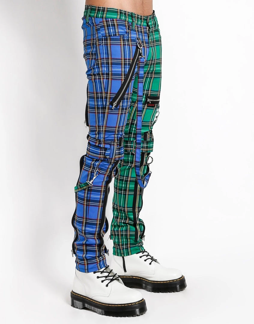 These Blue and Green Plaid pants were made for rocking out in. A punk rock wardrobe wouldn’t be complete without our classic slim leg pants with removable bondage straps and zipper details. Pant legs can be zipped for a change in fit, topped off with a zip fly and button closure.