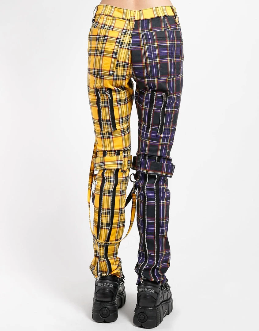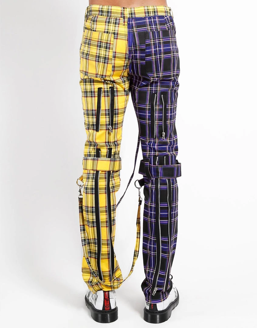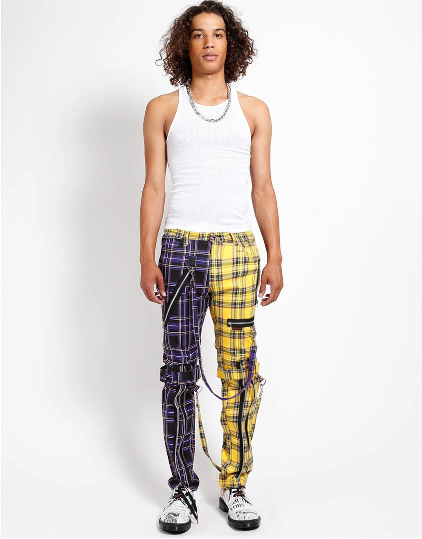 These Purple and Yellow plaid pants were made for rocking out in. A punk rock wardrobe wouldn’t be complete without our classic slim leg pants with removable bondage straps and zipper details. Pant legs can be zipped for a change in fit, topped off with a zip fly and button closure.