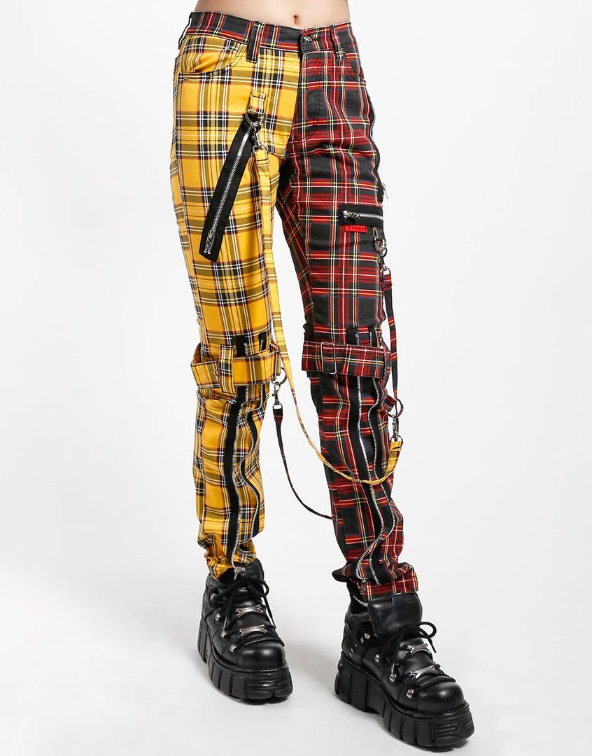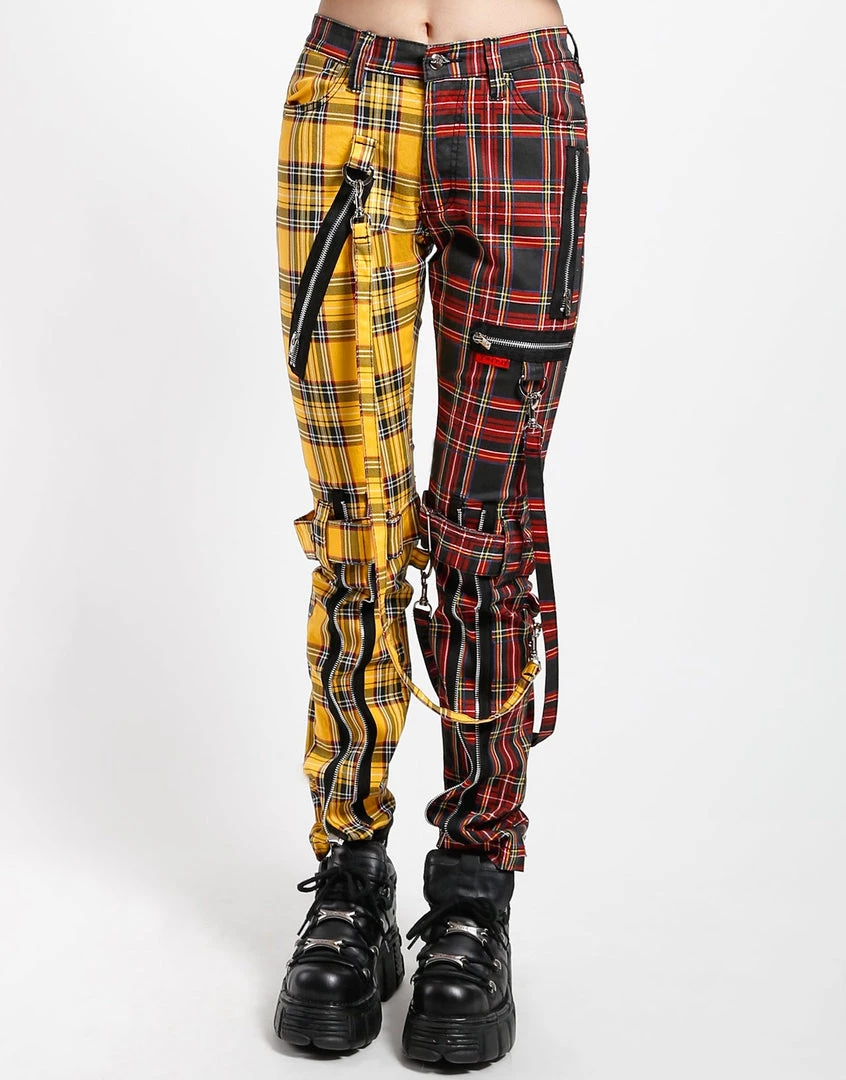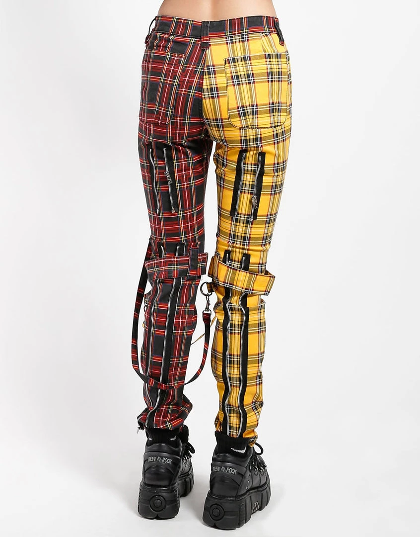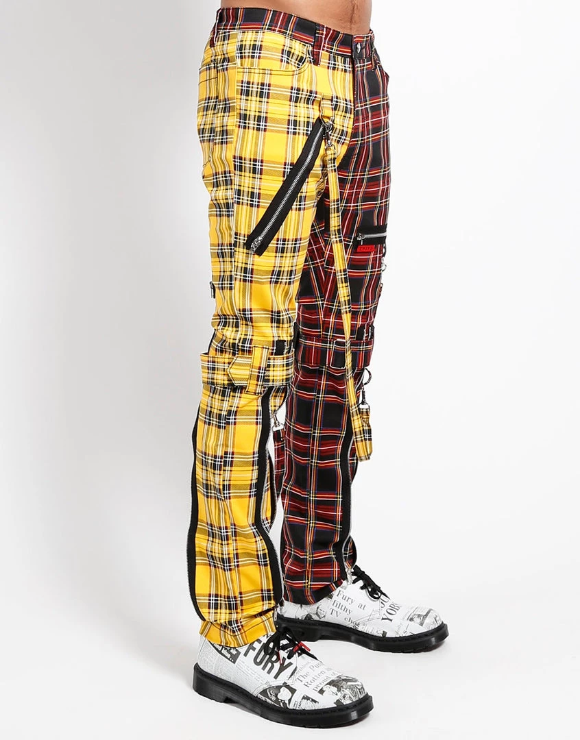These yellow and black plaid pants were made for rocking out in. A punk rock wardrobe wouldn’t be complete without our classic slim leg pants with removable bondage straps and zipper details. Pant legs can be zipped for a change in fit, topped off with a zip fly and button closure.
